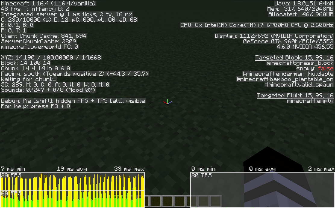 The other test, was a tiny bit less laggy. Here I covered the entire field with blocks and ontop put a few more layers of blocks. I made a hole to expose the crops to see how the FPS behaves.