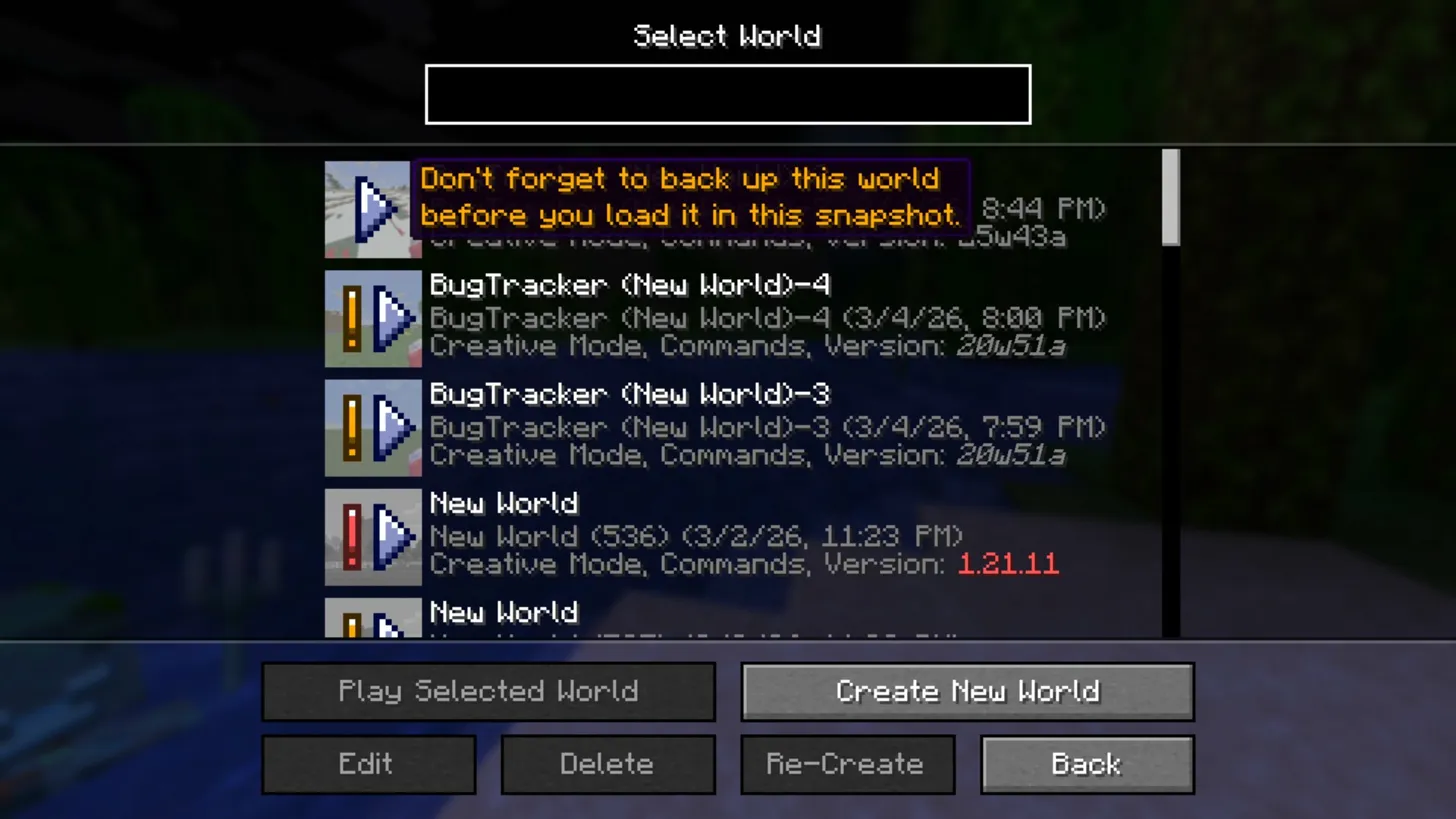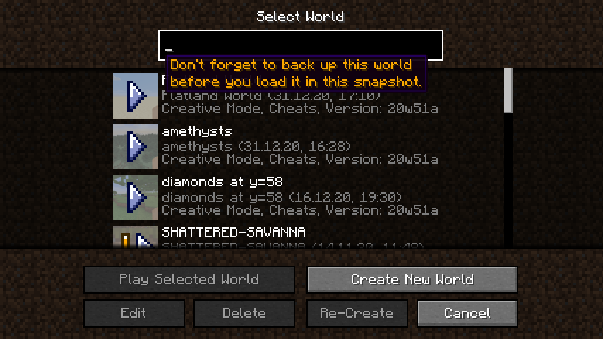 When touchscreen mode is enabled, the warning that you should back up the world before loading it is always shown when hovering over a world play button, even if the world has already been loaded in that snapshot. This does not happen if touchscreen mode is disabled.