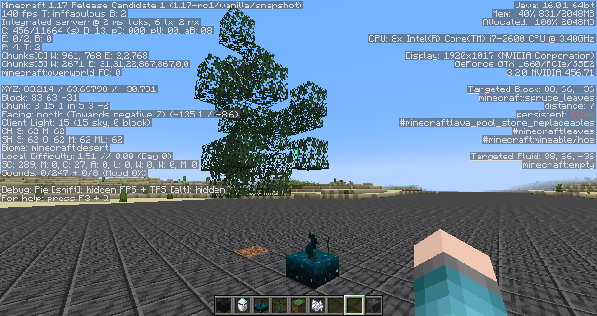 /fill ~-3 ~3 ~-3 ~3 ~5 ~3 minecraft:oak_leavesWait for some of the leaves to decay, and watch the sculk sensor closely as this happens.