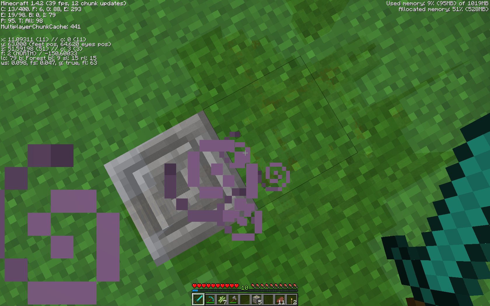 You can see through blocks(especially in the nether, not in the overworld except when using tiny view distance.)This affect disappears when using F1 mode. I use a custom texture pack that changes the grass texture on the side of blocks. The link is: https://dl.dropbox.com/u/110170711/Server%20Texture%20Pack.zip
