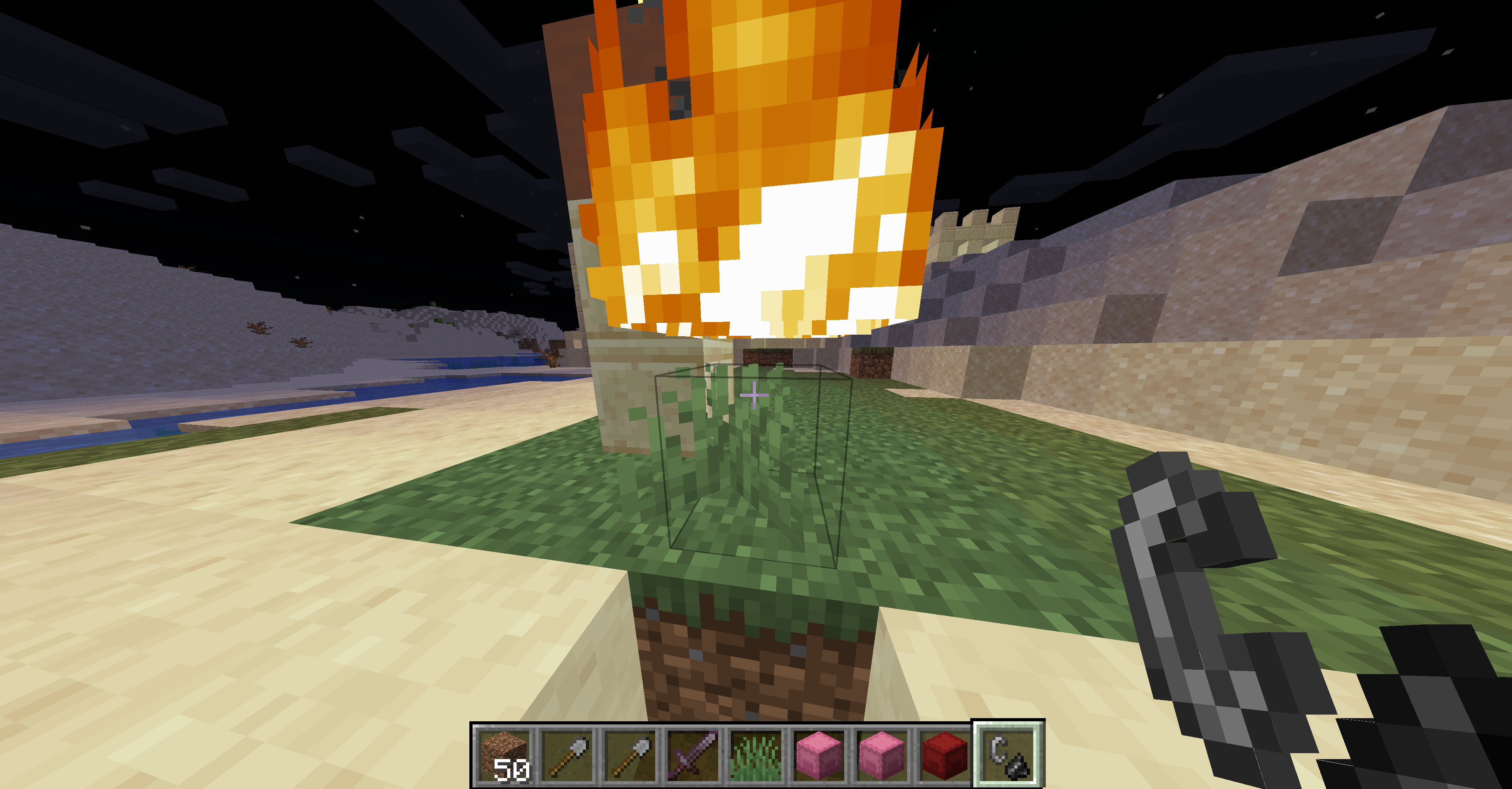 Fire burning on top of grass floats above the hitbox of grass due to it being smaller than a full block.