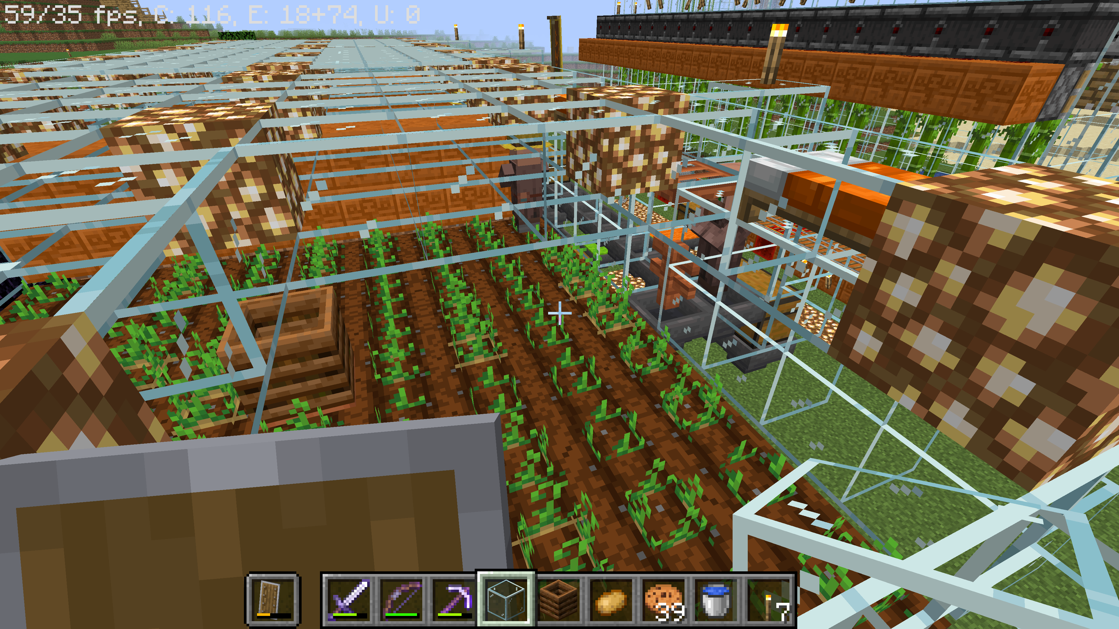 I will provide more pictures if needed. The farms are 9x9 farmland with water and a composter in the center. I spawned them directly into the farm using spawn eggs, so there is no way they have picked up any other seeds, etc. The hoppers do pick up the potatoes before the "hungry" villager does, so its not that. I even "replaced" a farmer to see if that would work, but it didn't. Mob griefing is on, and there are enough beds for all the villagers. I even tried putting up doors even though I'm pretty sure that isn't needed anymore. I turned off DayNightCycle, would that be the case? I also turned off WeatherCycle. (I'm on a server.) And I took off TraderVillagerSpawn, but I doubt that effected the farm at all. The farms are encased with glass, can they see through and are they distracted?