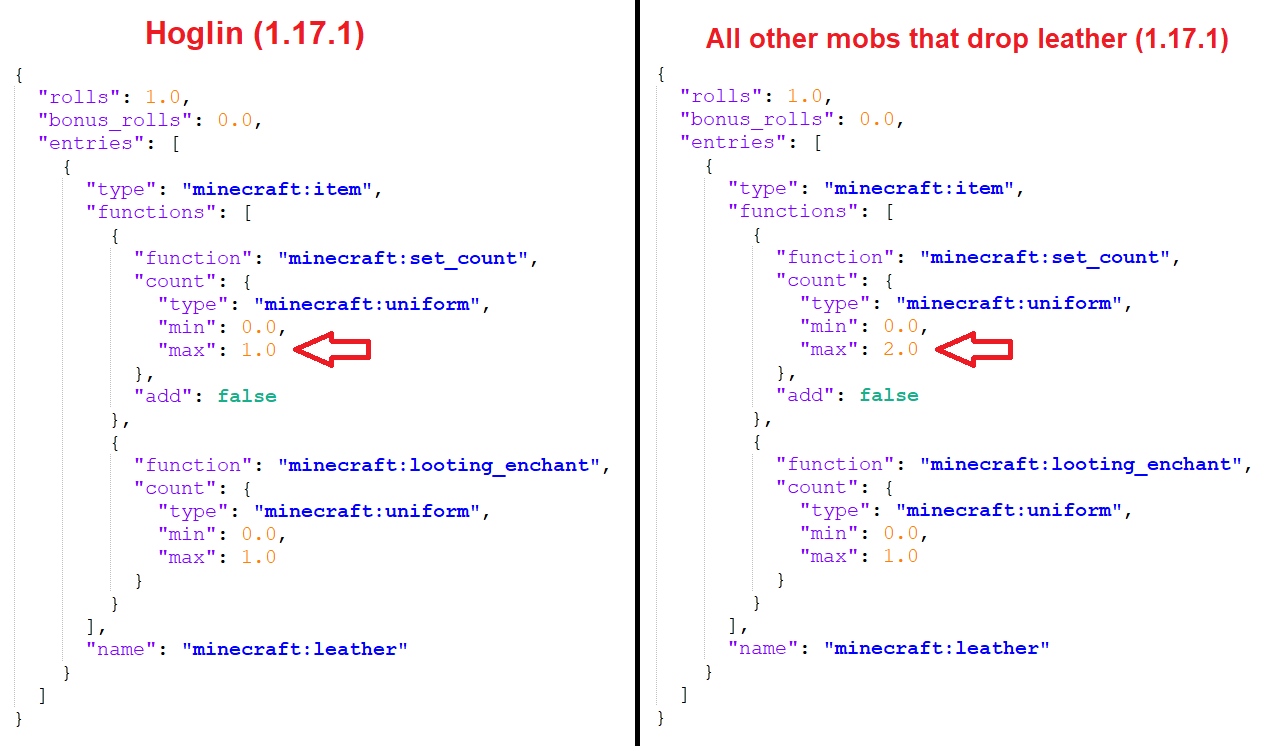 All animals that drop leather drop 0–2 leather upon death (excluding Looting). However this is not the case for hoglins, which only drop at most one piece of leather upon death (excluding Looting). This might be intentional, but it might just as well be an oversight.