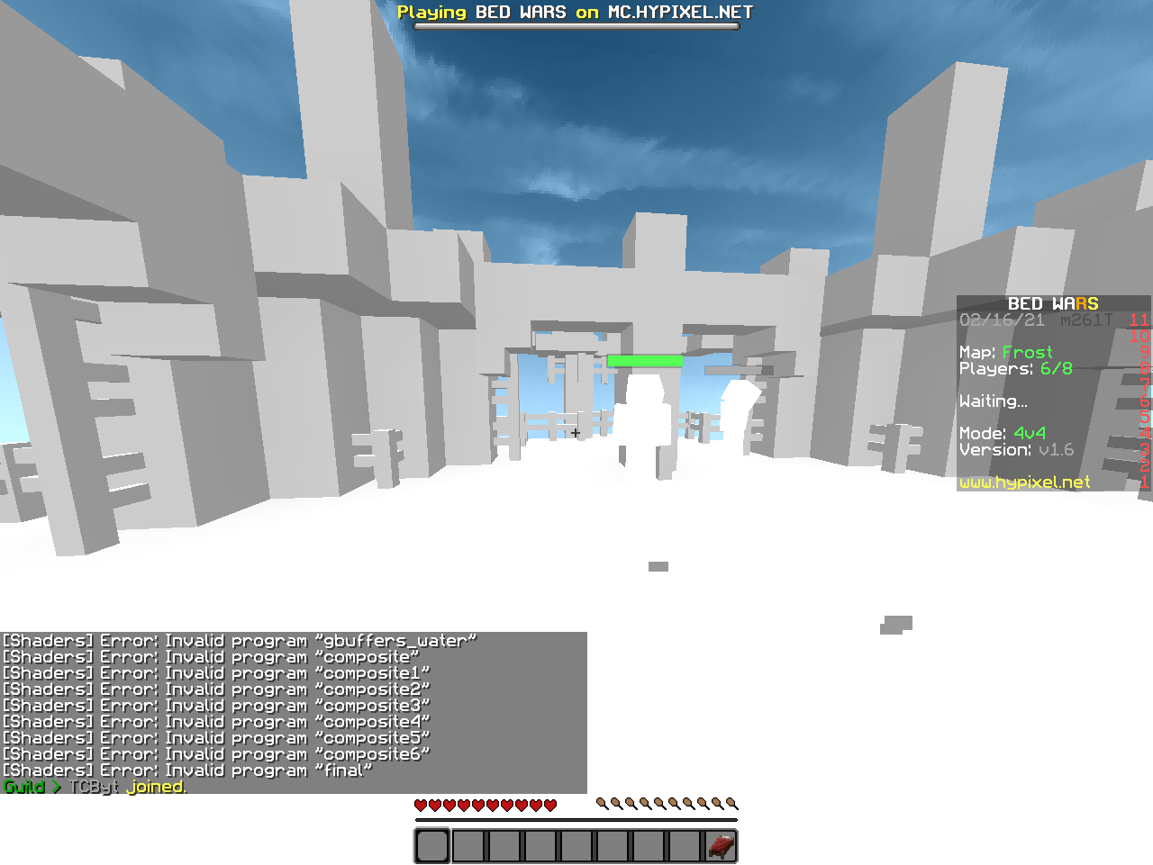 So I was trying to get some shaders working on my world. I got them on, but I accidentally messed with some setting. It ruined my world, making everything look black and white, with green as well. I tried to put the setting back to how they were, but it didn't work. It still wouldn't work. I tried logging in to hypixel to see if it only worked on my single player world. Nope. I started playing bedwars, when this text came up. It was saying "[Shaders] Error: Invalid program "gbuffers_hand" I don't know how to fix this, but I think it has something to do with the text that appereared in shat