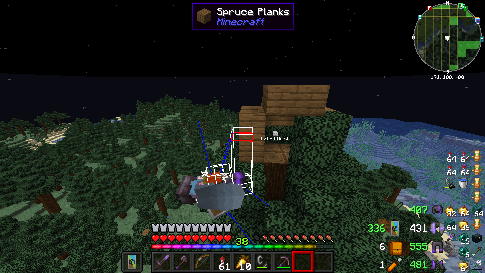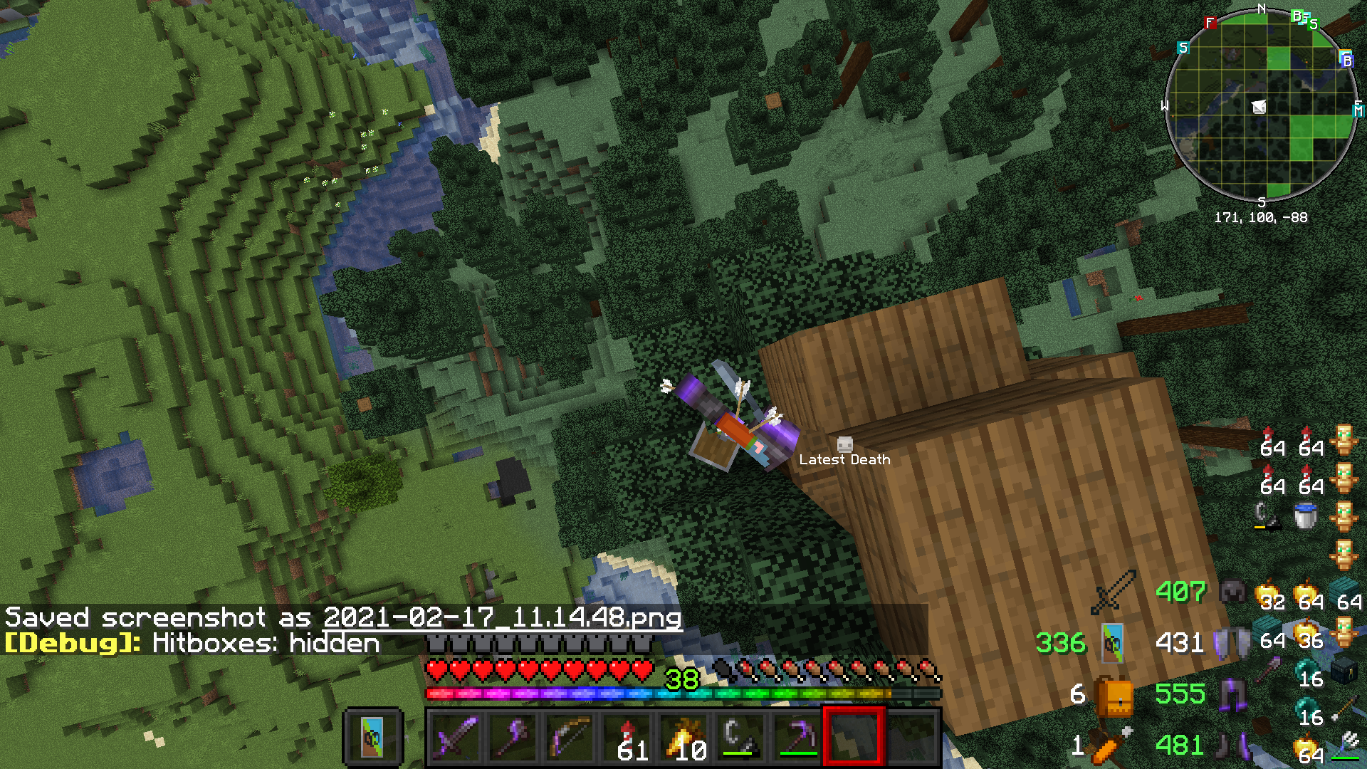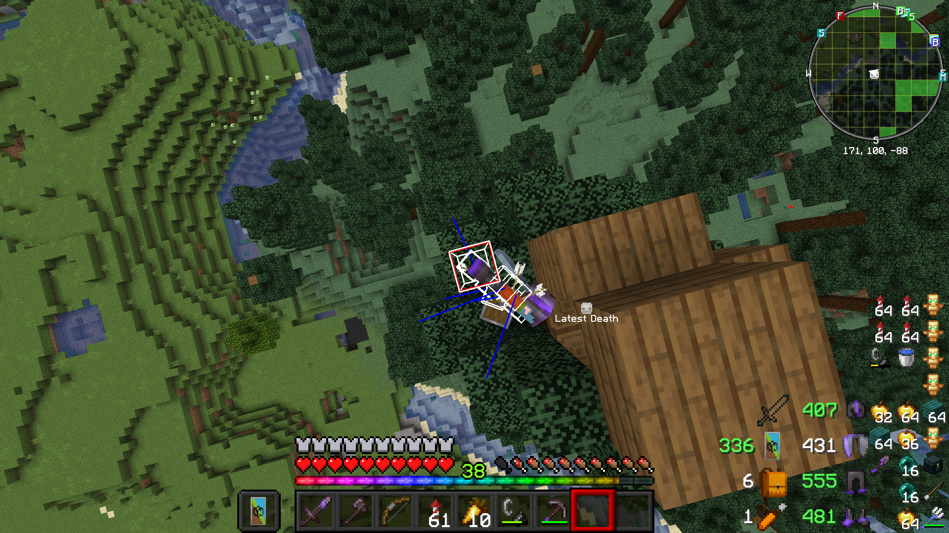 I had a massive number of hearts filled using health boost and i drank milk the game said i died but i didn't die then the character was vibrating, was red and slightly tilted(note: it can be done multiple times until the hitbox is perpendicular to the player model
