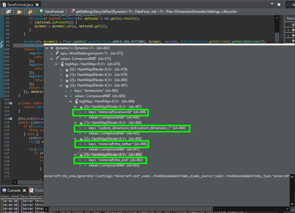Dynamic<T>at your break point contains the custom dimension alongside the other vanilla dimensions.