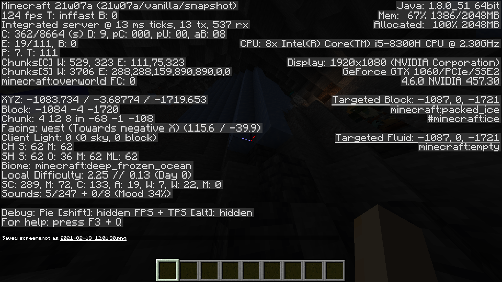 In the "deep frozen ocean" biome, packed ice will generate below the ocean, deep into the caves. However, this generation stops suddenly at y=0. Not sure if the ice itself is a bug, but the cutoff definitely seems like it is.
