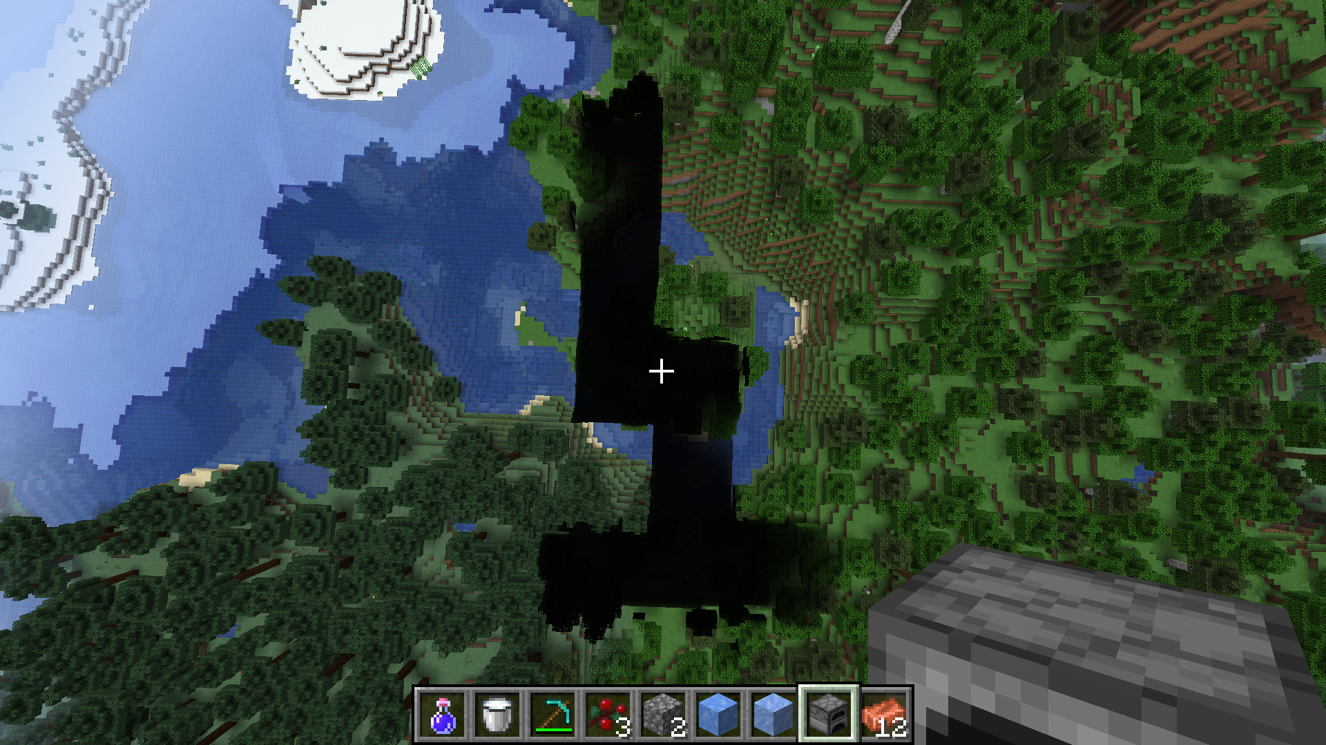 Seed -6208714676951964381, coordinates 318/64/560, you can see a patch of land at light level 0. Many but not all of these trees are cut out right where the darkness begins, leaving trees that just look split down the middle.