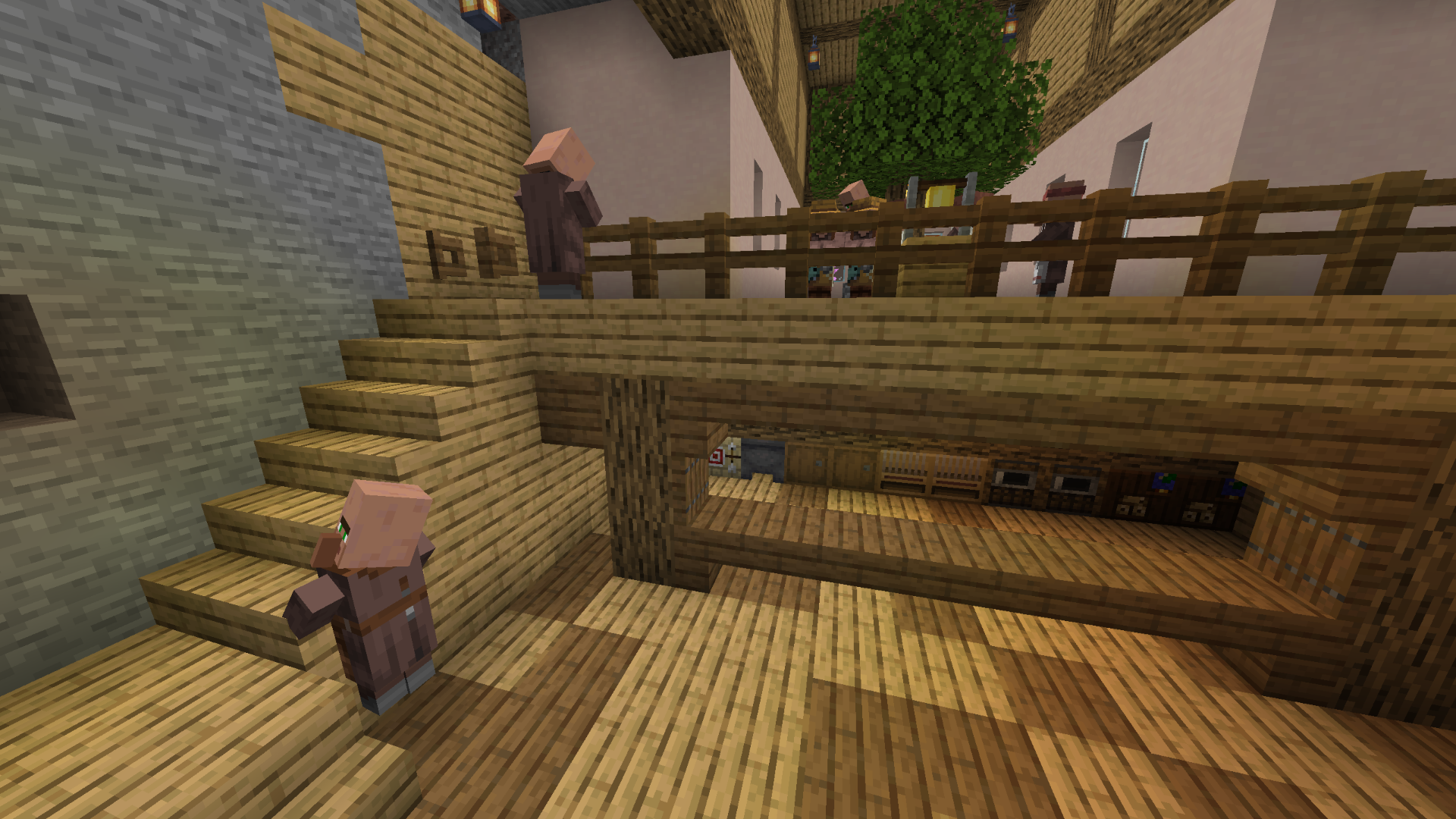 The first image below is about how a villager (The one in the center of the image, looking at the fletching table) would prefer to walk threw a fence and stand on top of a celling rather then go threw a gap to get to their work station.