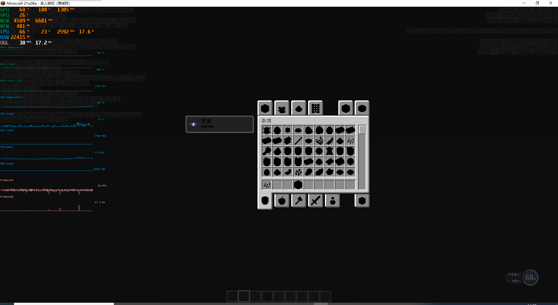在21w08a中,如果你有夜视效果,在y=-64之下所有界面都变成了黑色