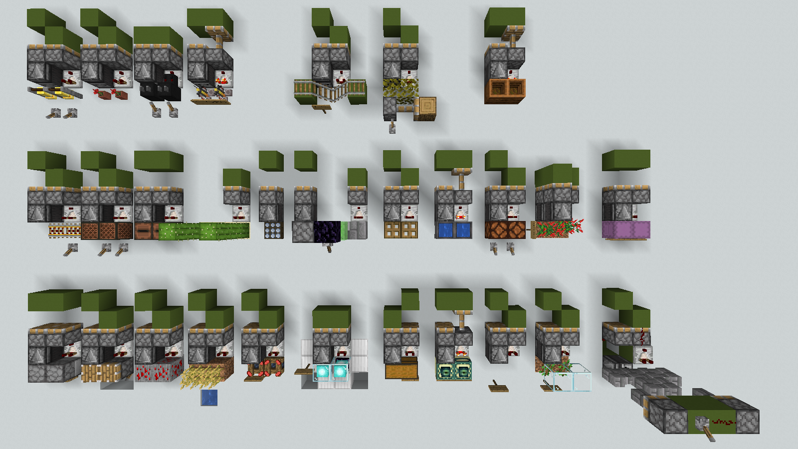 I tested 32 different blocks (29 of them shown in the picture) with both a comparator and an observer, skipping the more obvious or redundant blocks.