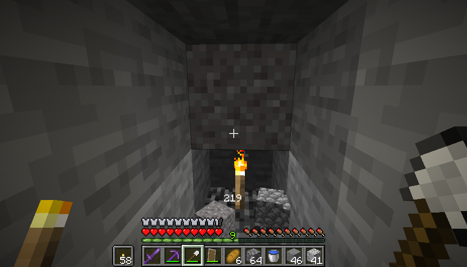 To reproduce this bug, Find a column of gravel. Hold a tool in your main slot and a torch in the offhand. Destroy the block underneath the gravel or the bottom-most gravel block and quickly place a torch. Rarely, the gravel will just stay on top of the torch and stay there. Most of the time, the gravel will be destroyed as it should be. What should happen is that the gravel would fall onto the torch and destroy itself, leaving gravel items to be picked up. I didn't notice it happening until very recently. I think placing the torch very fast causes this. I took a screenshot and recorded about 20 seconds of gameplay up to when the glitch happened.