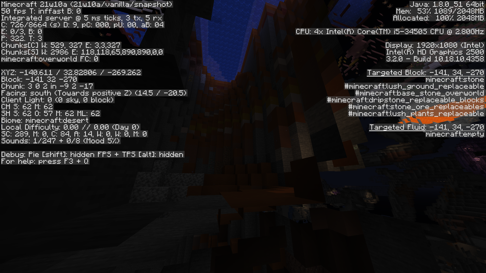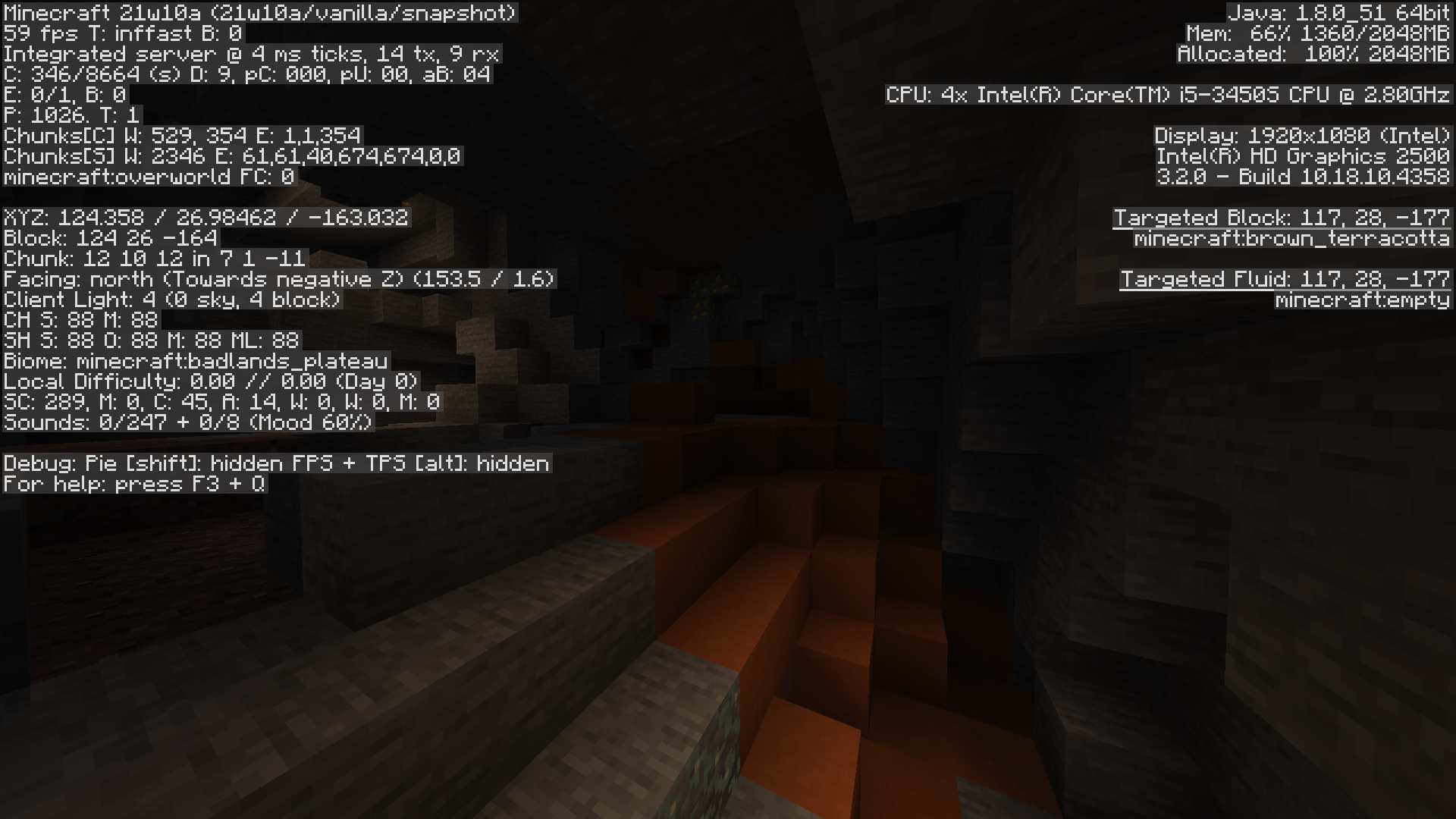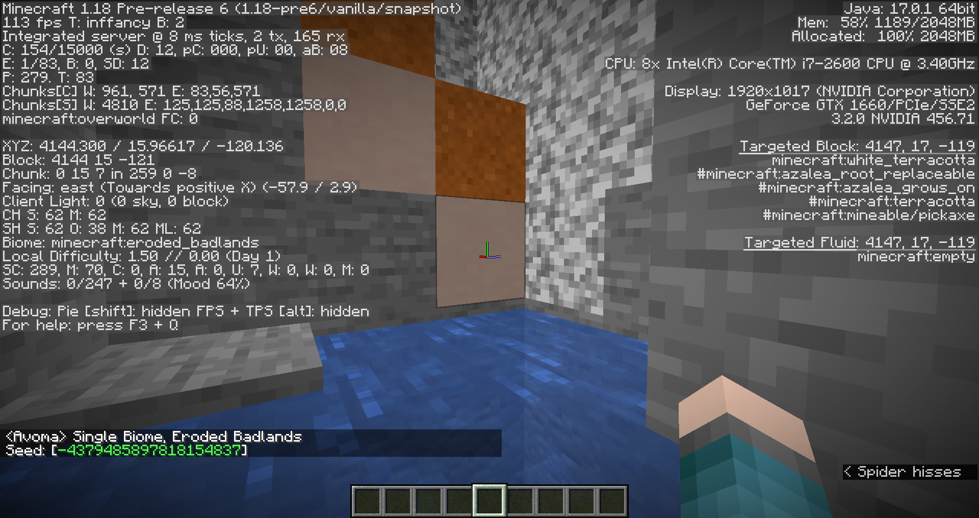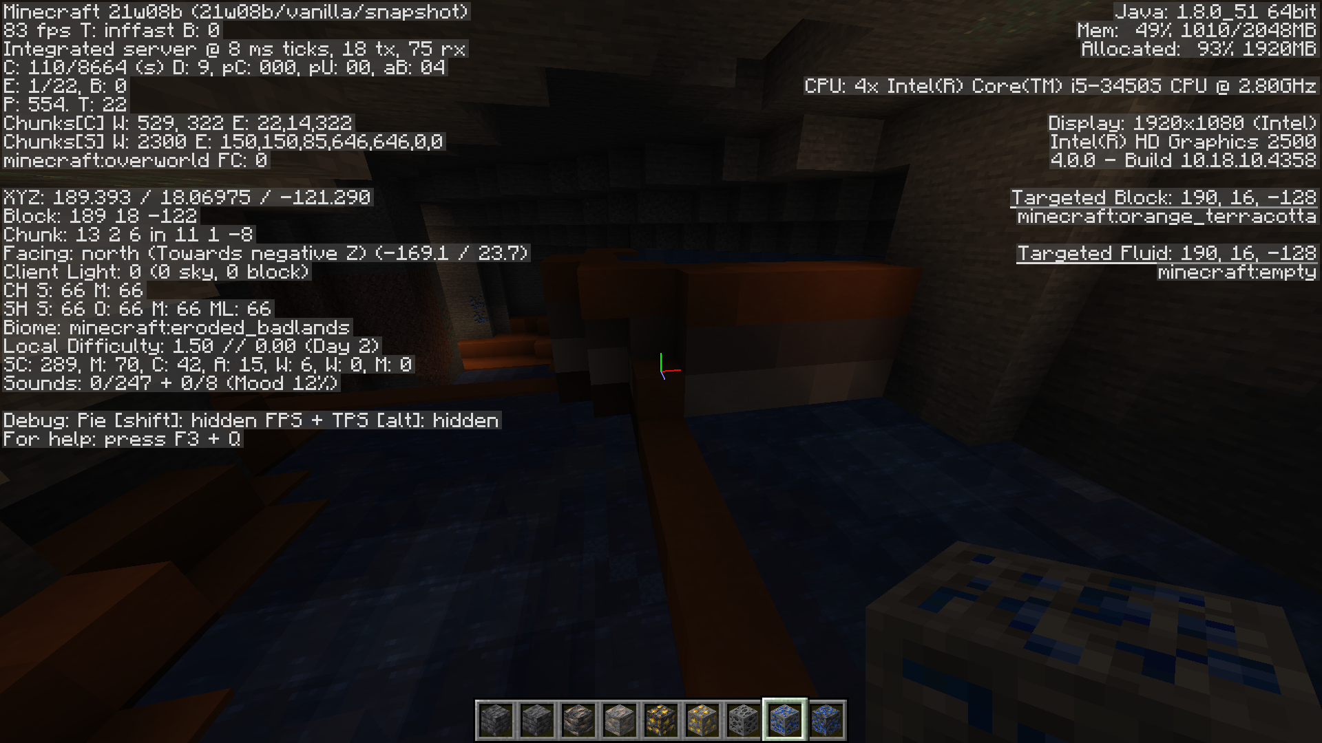 Generation bug where in badlands biomes, terracotta generates in caves deep enough where its obvious its not supposed to be there (y=18 in the screenshot provided.) In this case it generated near an aquifer, I'm not sure if that's aquifer specific or it happens in other cases as well.