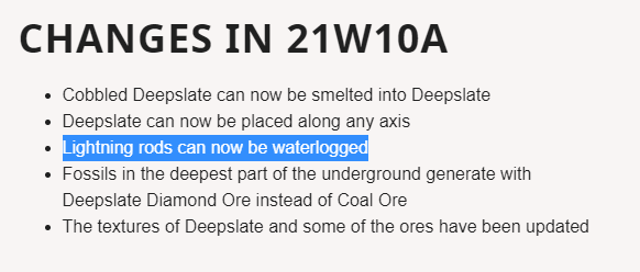 According to the changelog https://www.minecraft.net/en-us/article/minecraft-snapshot-21w10a the lightning rod should now be waterloggable, but it isn’t.