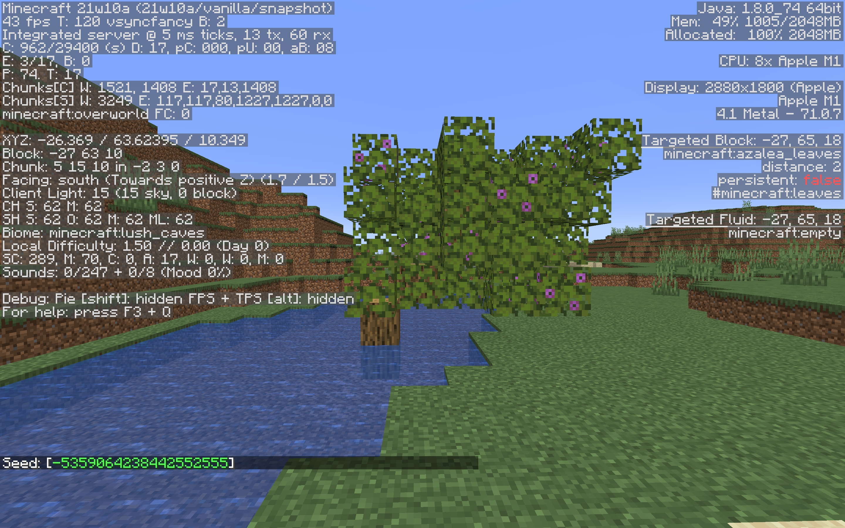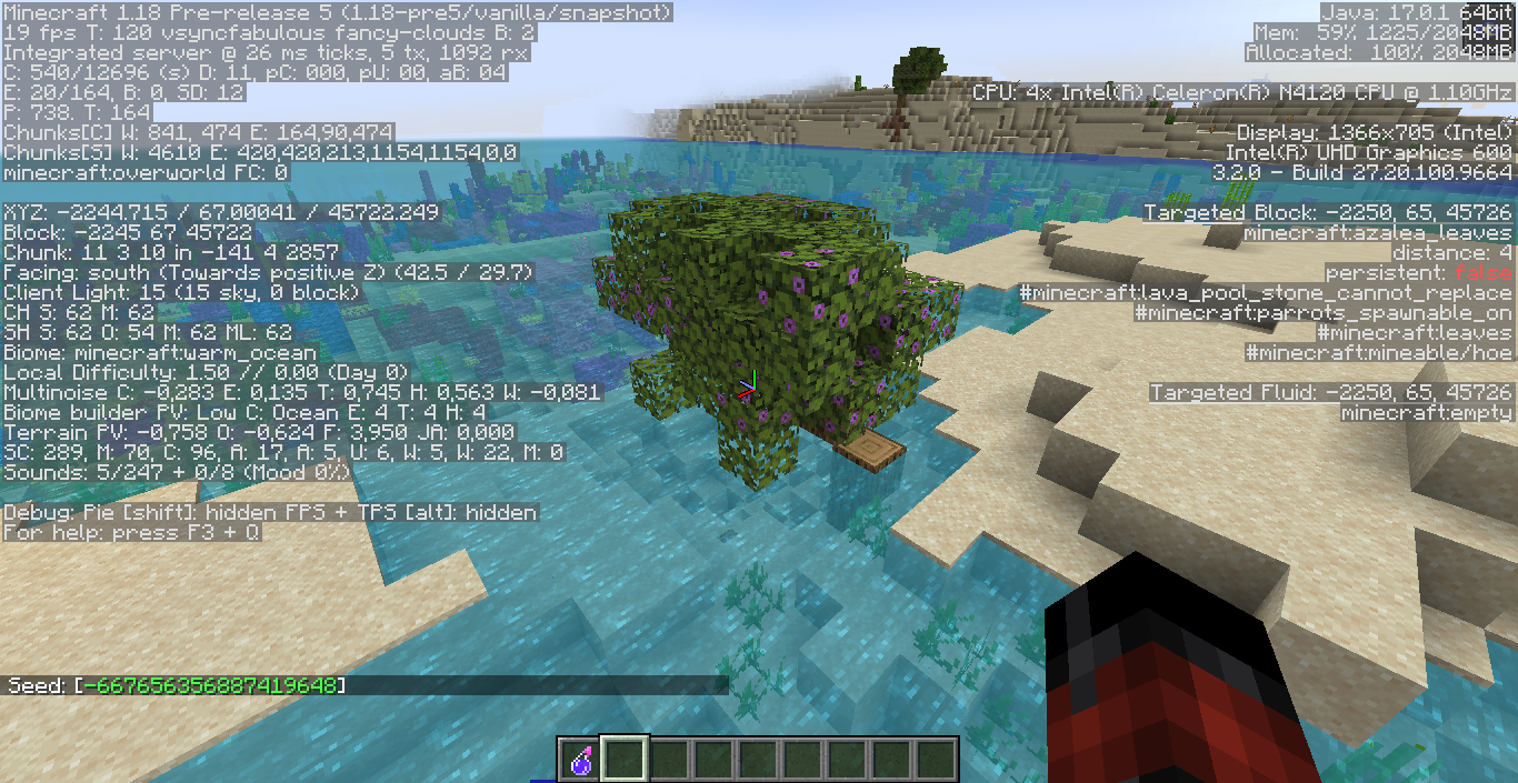 The seed is -667656356887419648 and the coords are -2244 67 45722. I have attached them on the screen. The location I have find is that a azalea tree in water but not completly submerged.