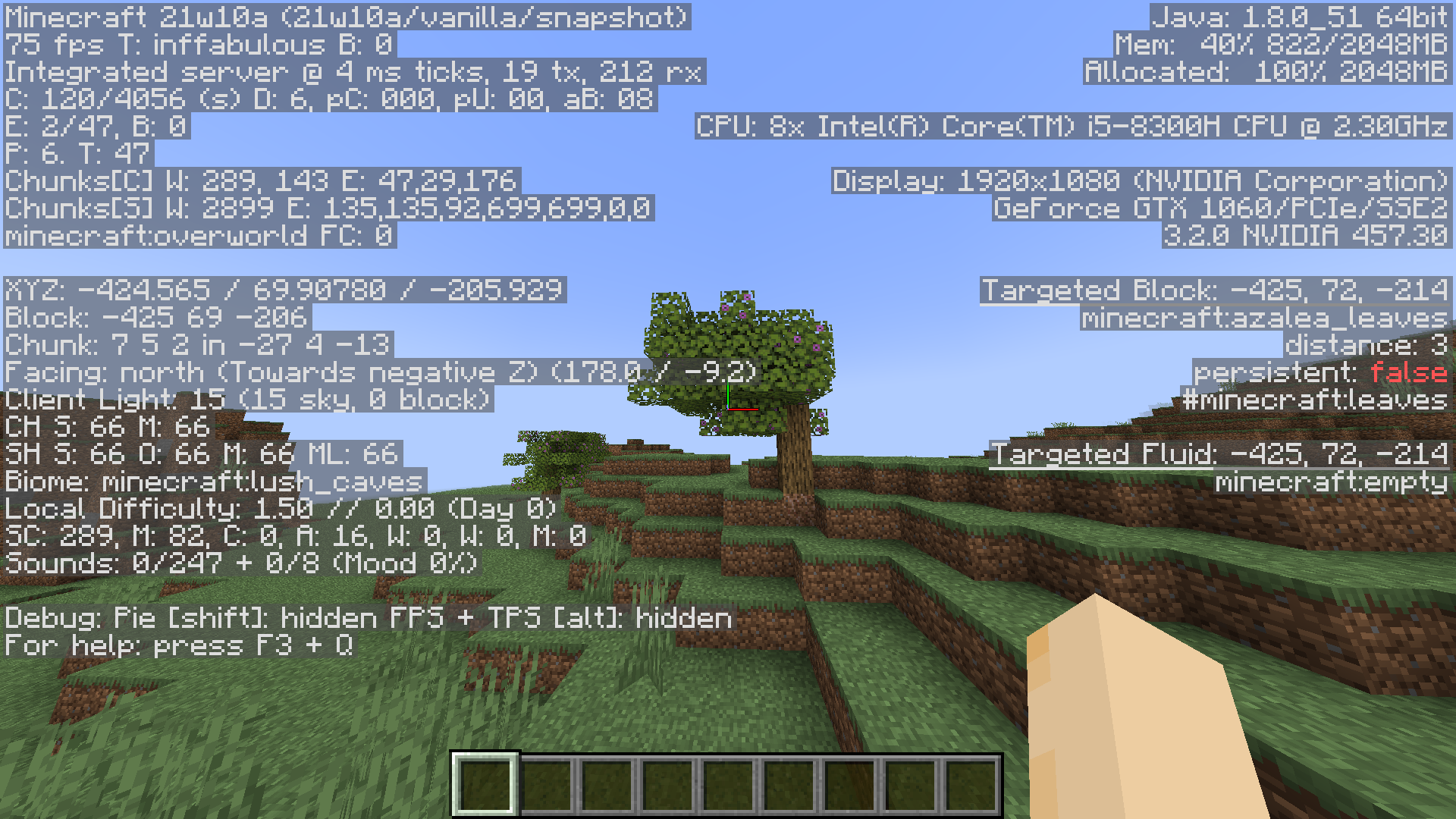 When using the new "Lush Caves" custom generation, the azalea trees have very buggy generation. Most trees have leaves that aren't centered on the trunk and are sometimes not attached, trees can generate in water, even several blocks deep in lakes, and some trees generate without a trunk connecting to the ground.