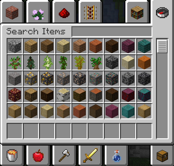 Both deepslate and normal variants of gold, iron, copper, and coal ores are grouped in the creative inventory, in addition to nether gold ore. However, diamond, redstone, and lapis lazuli are not grouped with them.