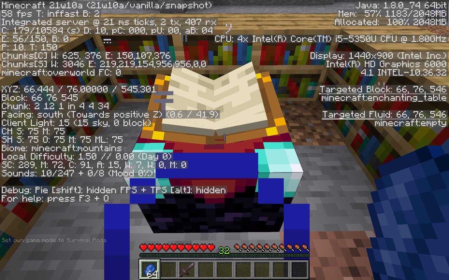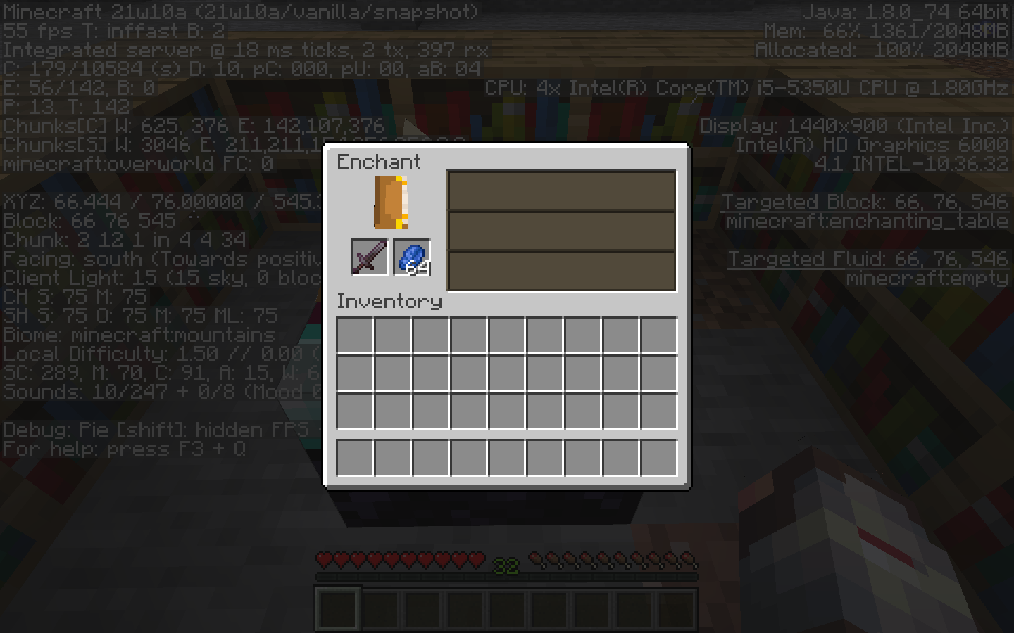 In worlds updated from 21w08b to 21w10a, it becomes impossible to enchant items using an enchantment table in creative or survival mode. After putting in the item you want to enchant, none of the enchantments will show up.