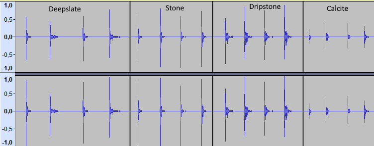 A good way to test this is by putting down some tuff and then putting down some calcite. You will notice the step and break sounds are much softer for calcite.