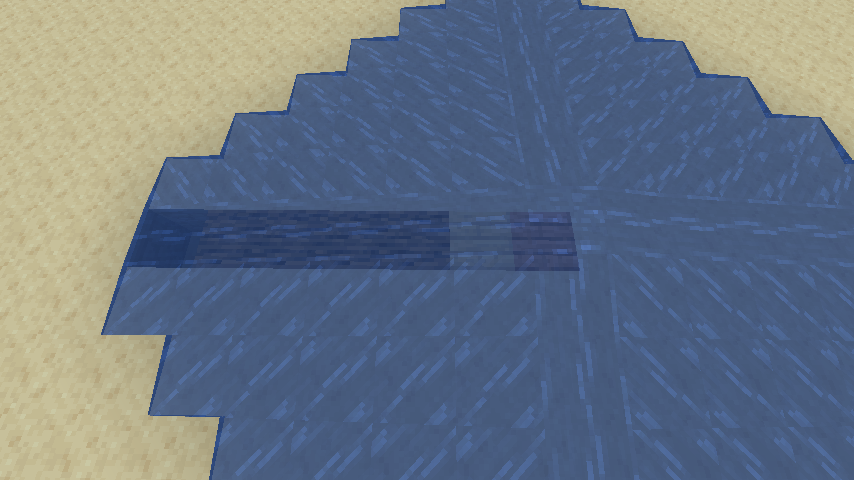 If a water source is placed such that there are up to four blocks between the block it's on and a one block drop, the water will move towards that drop as expected. However, for a gap of five or more, the water will begin to spread out everywhere instead. Expected behaviour would be for it to target the hole regardless of distance if within range.
