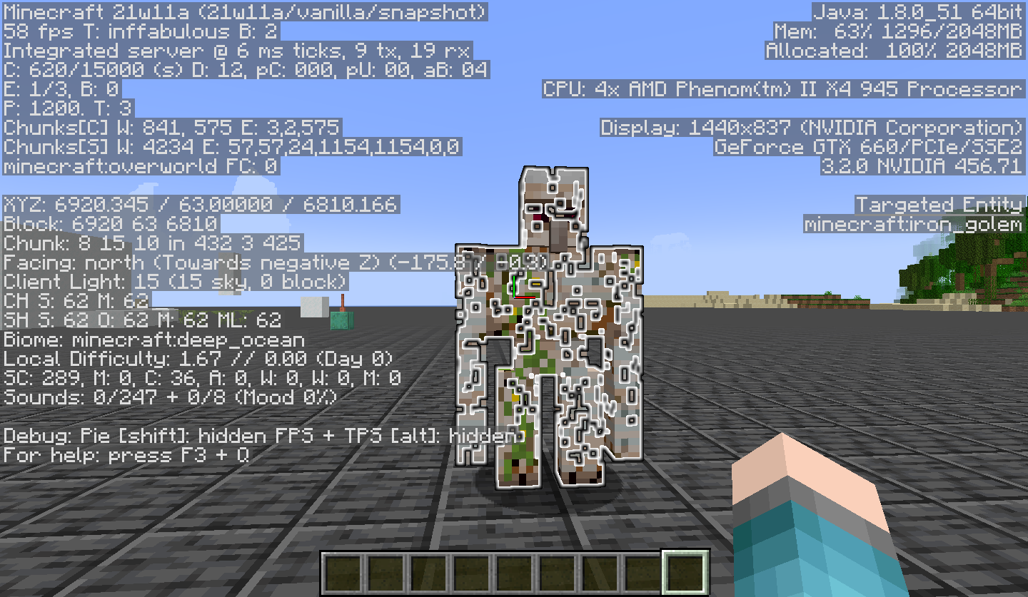 Also, only iron golems with intermediate levels of health have their cracks outlined. When the golem's health becomes very low, the cracks stop being outlined. This behavior is the same for both MC-173834 and MC-220270, and this behavior was previously mentioned in this comment from MC-173834.