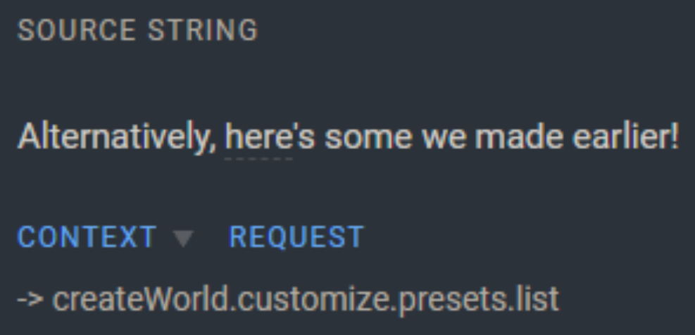 createWorld.customize.presets.list | Alternatively, here's some we made earlier! | Alternatively, here're some we made earlier! |