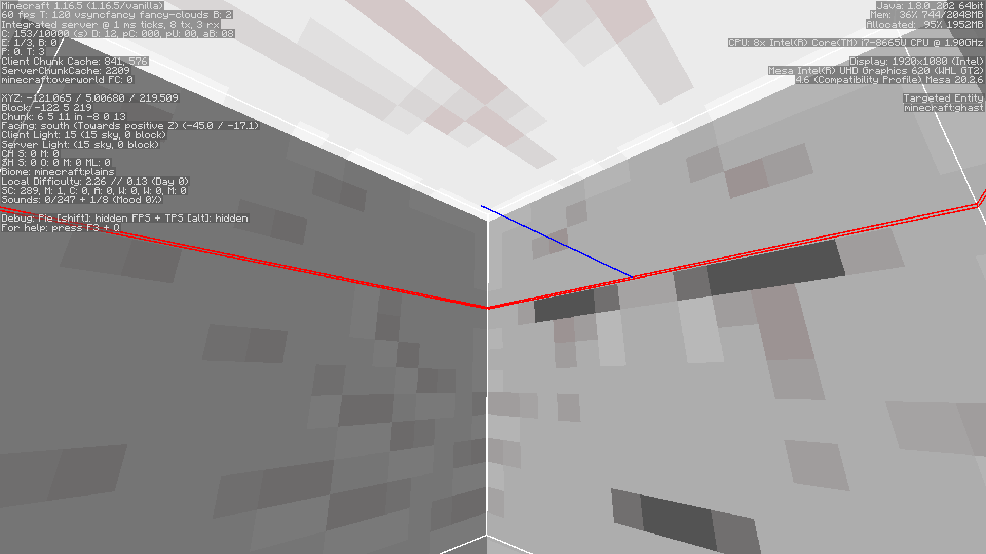 When hitboxes are turned on, the blue line of sight of the Ghast points inward into the body rather than outside.