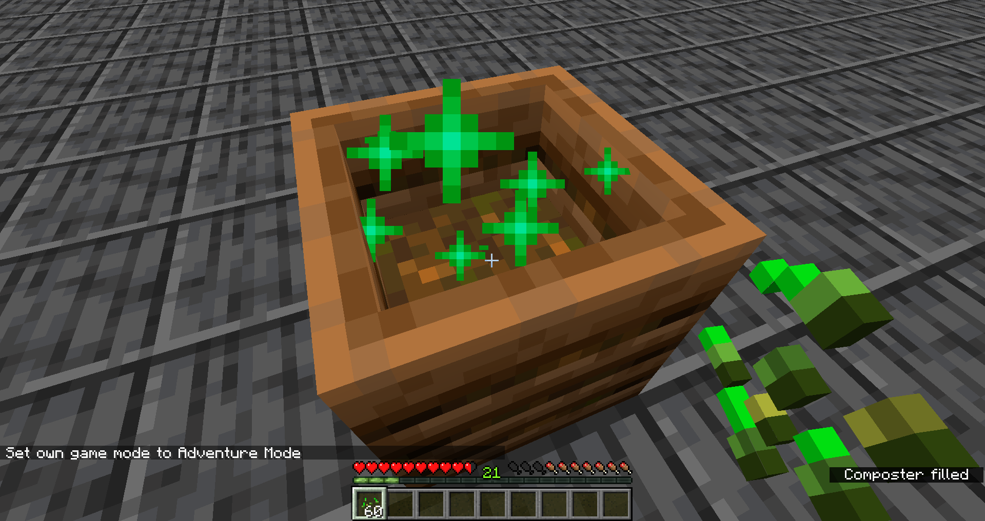 ...If we look at the above class, we can see that there is only one necessary check that's carried out before allowing players to fill composters. This check is to see if the "level" block state of the composter is below a value of "8", and if the player is holding an item that can be composted. If this requirement is met along with the other criteria within this method, composters can be filled. The game doesn't check to see what abilities the player possesses (what game mode they are in) before allowing them to fill composters, therefore resulting in this problem occurring.