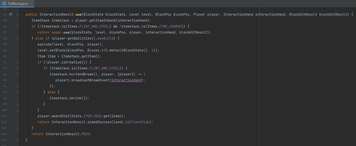 ...If we look at the above class, we can see that there is only one necessary check that's carried out before allowing TNT to be ignited. This check is to quite simply see if the player is holding either flint and steel or a fire charge at the time of the interaction. If they are, the TNT will be ignited. The game doesn't check to see what abilities the player possesses (what game mode they are in) before allowing them to ignite TNT, therefore resulting in this problem occurring.