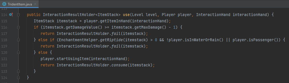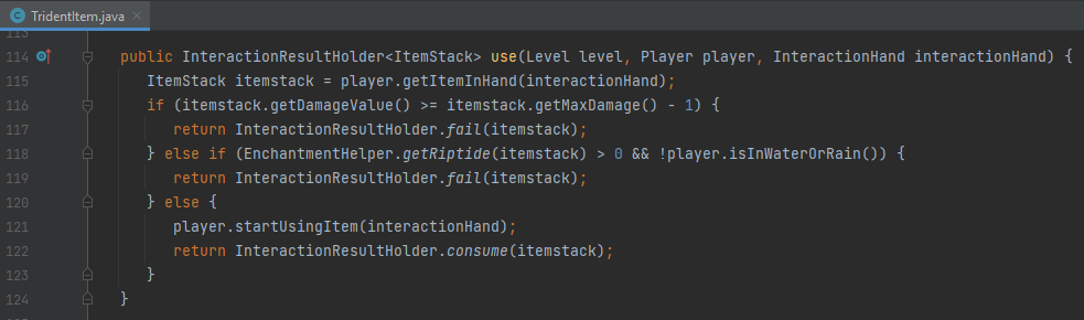 ...If we look at the above class, we can see that there are two checks that are carried out before allowing the player to use a trident enchanted with riptide. One of these is to check if the player is actually holding a trident enchanted with riptide and the other is to check if they are in water or rain. The game doesn't check if the player is currently riding an entity before allowing them to throw a trident enchanted with riptide in the rain, therefore resulting in this problem occurring.