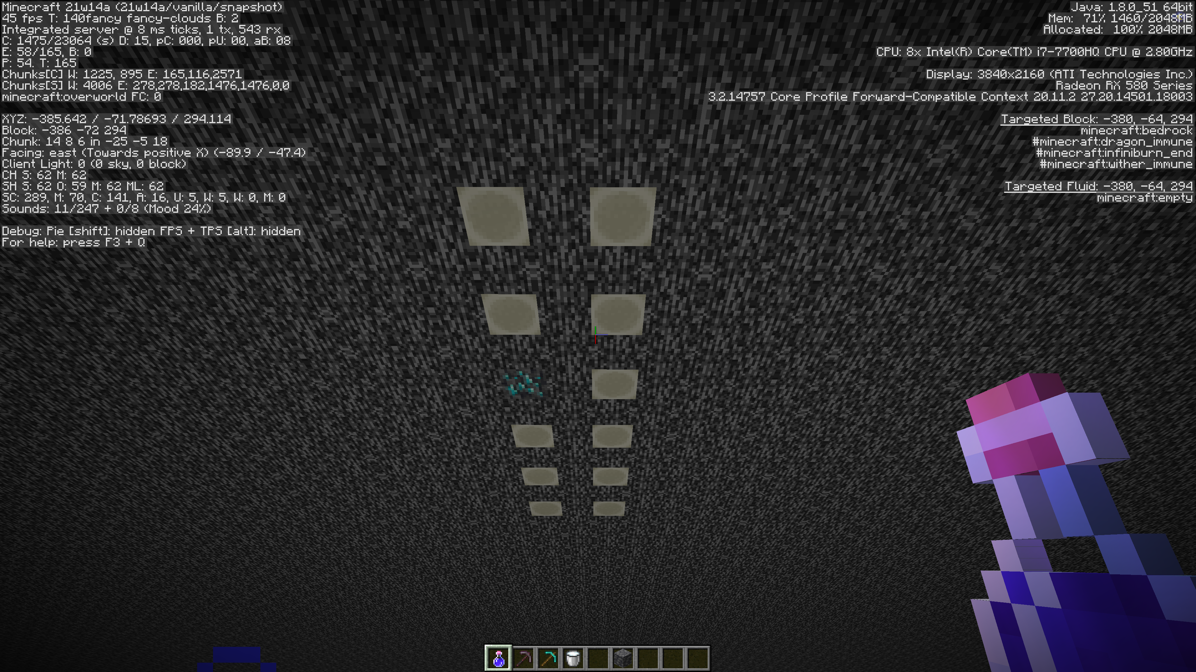 wile exploring the screenshot i wanted to se how far down was bedrock. once though bedrock and under the world i saw bone and Dimond ore inside the final bedrock layer. if found in a survival game player could mine though the world and fall out of it