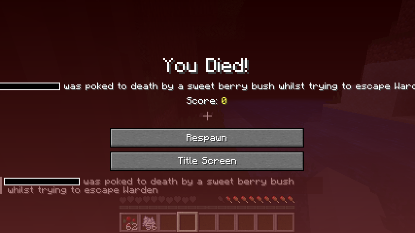 For some reason, the screen couldn't hold all the words in the death message. Please make death messages in the death screen able to go to another line when it runs out of space on that line, like that chat box which displayed the death message.