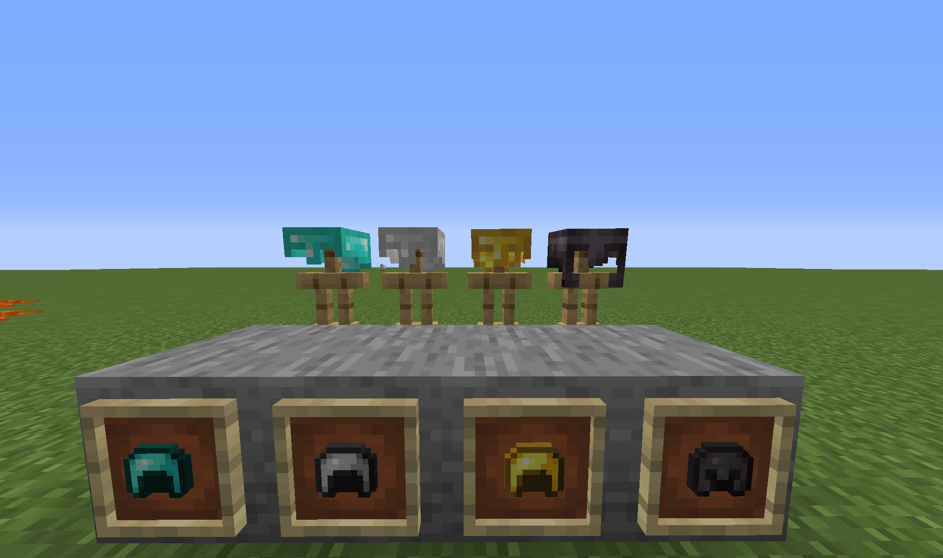 The textures of equipped iron helmets, gold helmets and diamond helmets are incosistent with their item counterparts.