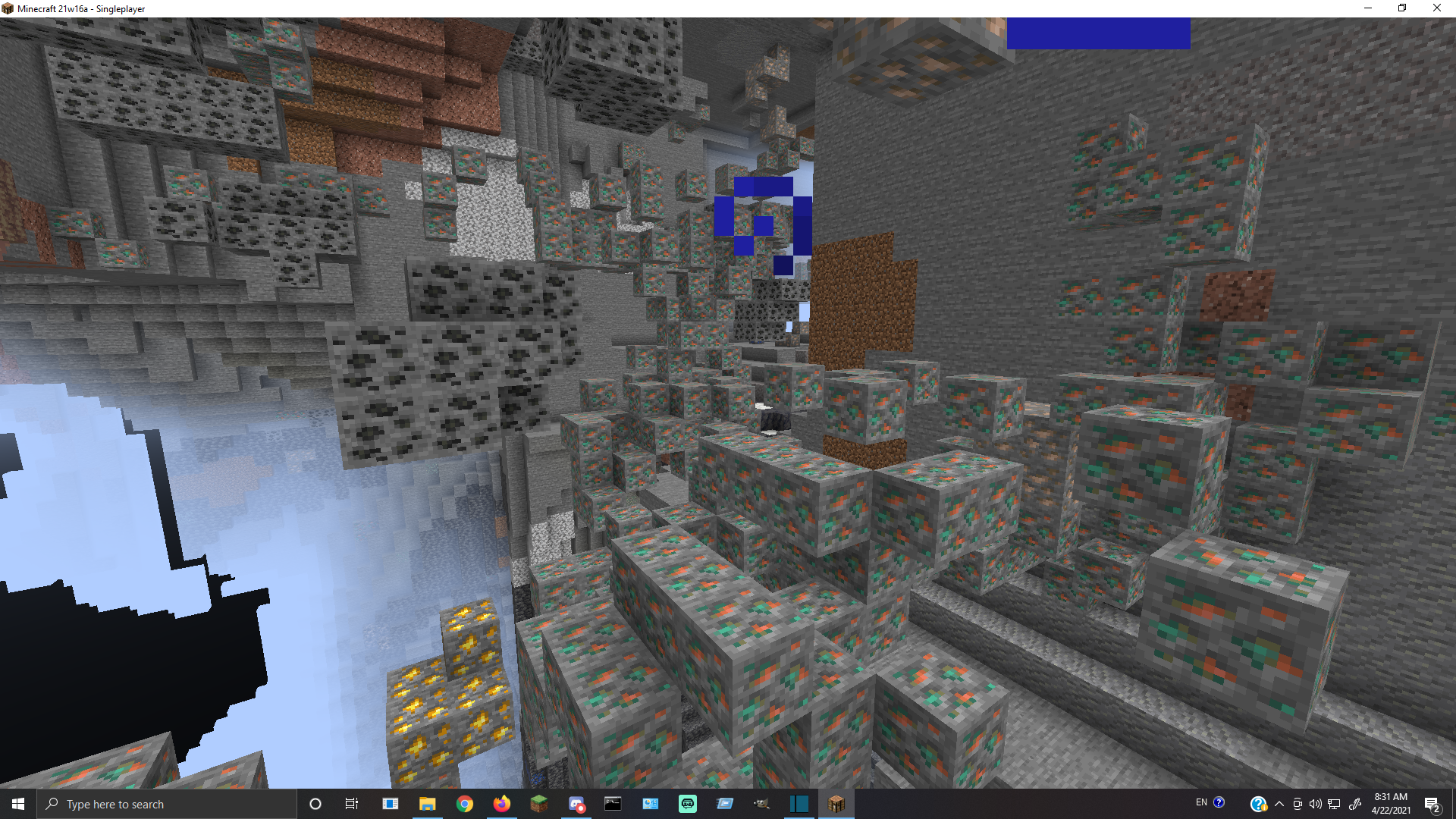 If you use the data pack for the extended height and world generation for the latest snapshot, there can sometimes be massive ore veins generating. In the patch notes, it sai\id there would be large veins, but I don't think they were supposed to be this big.