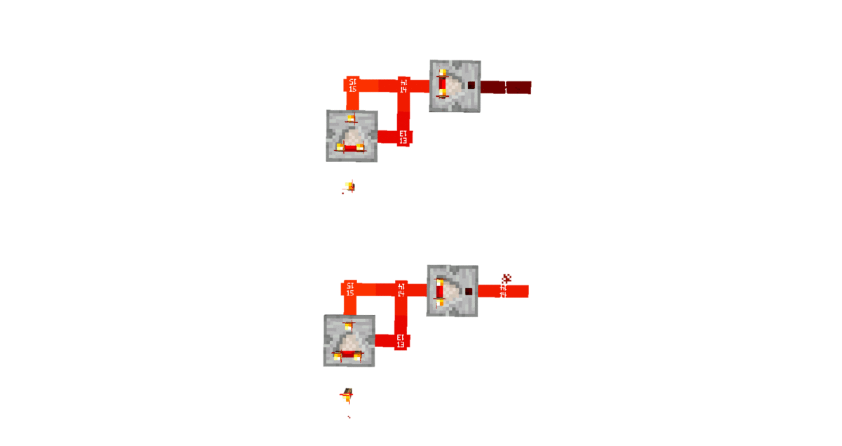 pattern_at_0_0.png: The purple block in the center of the image shows the coordinates (0, 0), the red block the positive x direction.irregularity.png: This image shows an irregularity like described in Disclaimer.indirect.gif: The rightmost comparator was placed on an unresponsive position.test_setup.gif: The rightmost comparator was placed on a responsive position.comparison.gifThe upper rightmost comparator was placed on a responsive position; The lower rightmost comparator was placed on an unresponsive position.