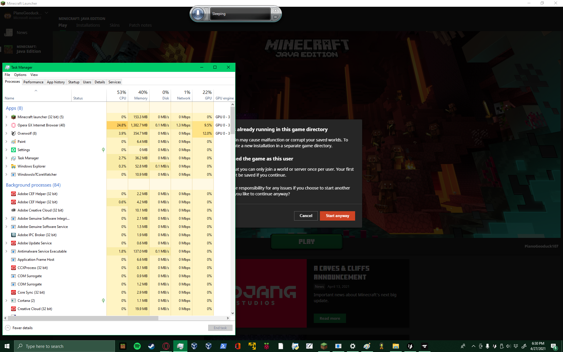 I can't launch the game. I am using an executable for the engender mod. I can't add it to the files cause it is too big. The launcher opens fine but the game does not and the launcher thinks the game is running in that exact directory. Though is[JAVA(TM) platform SE binary] is not running.