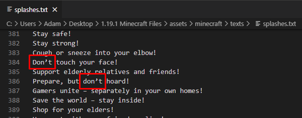 Can confirm in 1.19.1. These two pieces of text can be found on lines 384 and 386 with splashes.txt.