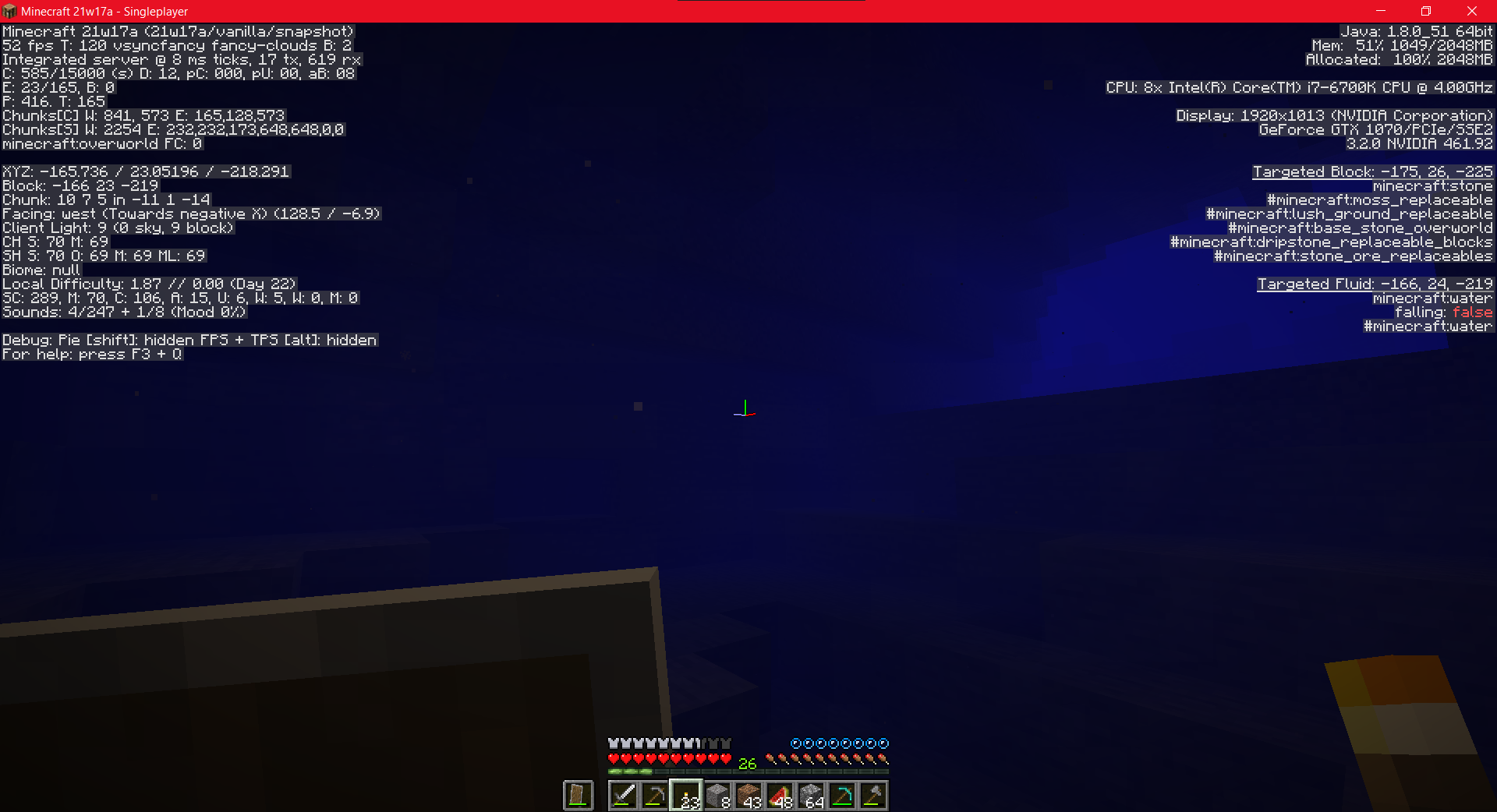 Playing in 20w17a with the caves and cliffs datapack in singleplayer. Going near aquifers causes the biome to become null and it persists everywhere after initially becoming null. Every time you cross a chunk after your biome becomes null a very prominent lag spike happens. The null biome can be fixed by restarting the world when not in or near an aquifer. I have tested this with multiple aquifers and they all cause the biome type to become null and then lag spikes will happen every time you move between chunks until reloading the world when away from an aquifer.