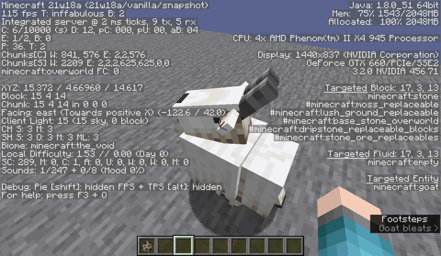 Spawn a goat, wait for it to walk around, and as it does, watch the subtitle overlay closely.