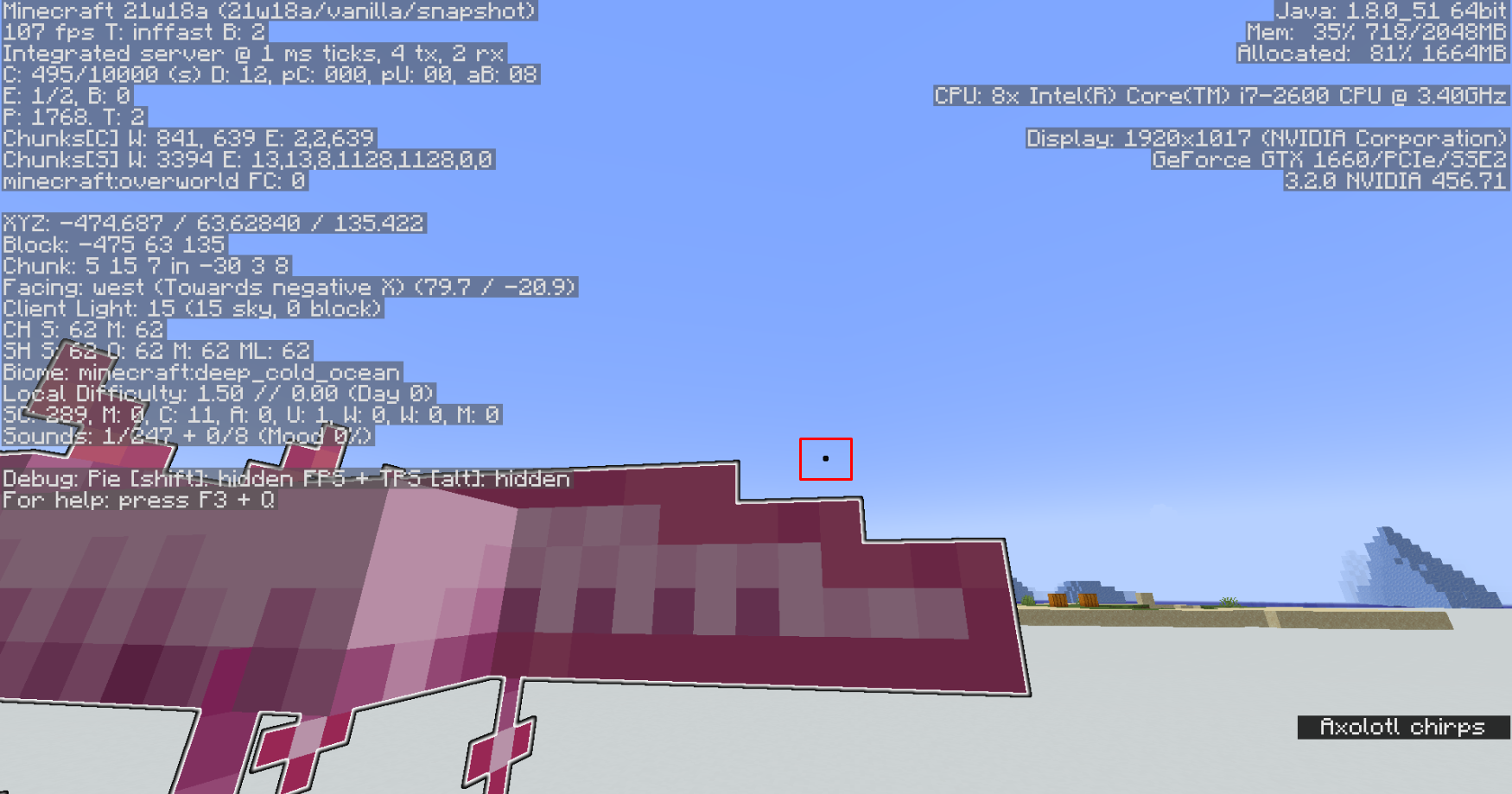 /summon minecraft:axolotl ~ ~2 ~2 {NoAI:1b,Glowing:1b}Look at the axolotl's tail from several different angles.