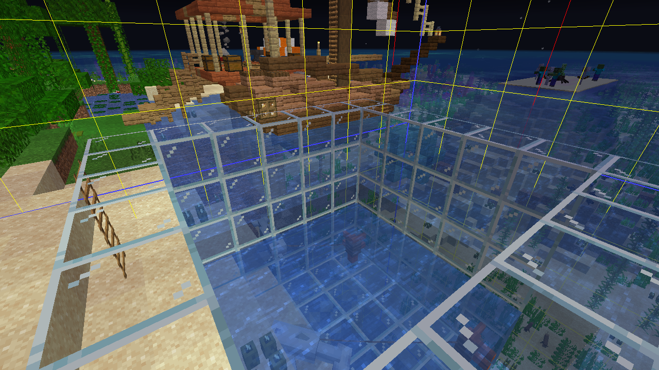The enclose is entirely in the same chunk. The glass wall is 3 blocks high above the water so dolphins cannot jump over it.