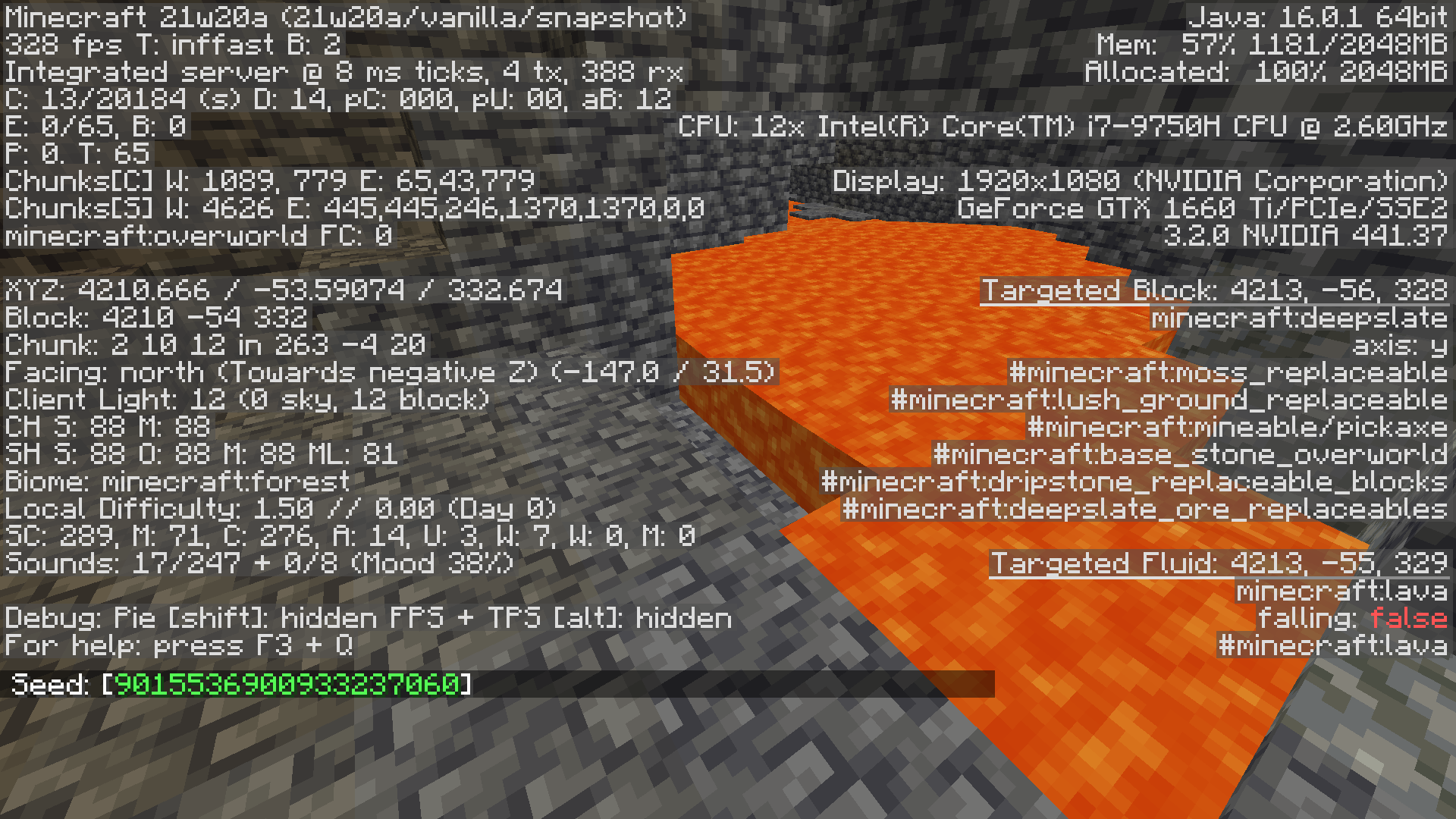 When I was looking around for a end portal room in a stronghold in one of my worlds, I came across 2 layers of non-flowing lava. The seed is -1133765157981061987. The seed for the 21w20a is -5758760364720378710