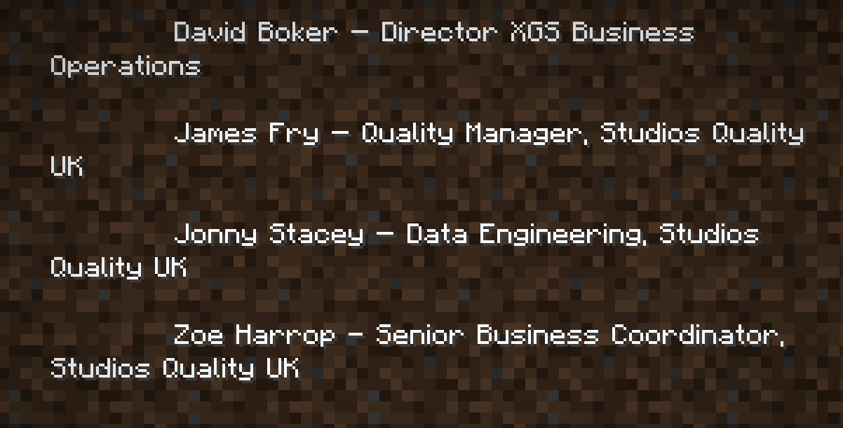I agree - their MC credits should have people who worked on the game, not random Mojang employees/people from other parts of the MC Franchise. I'm betting that all the new names are for purely legal reasons - there seems to be no consistency.
