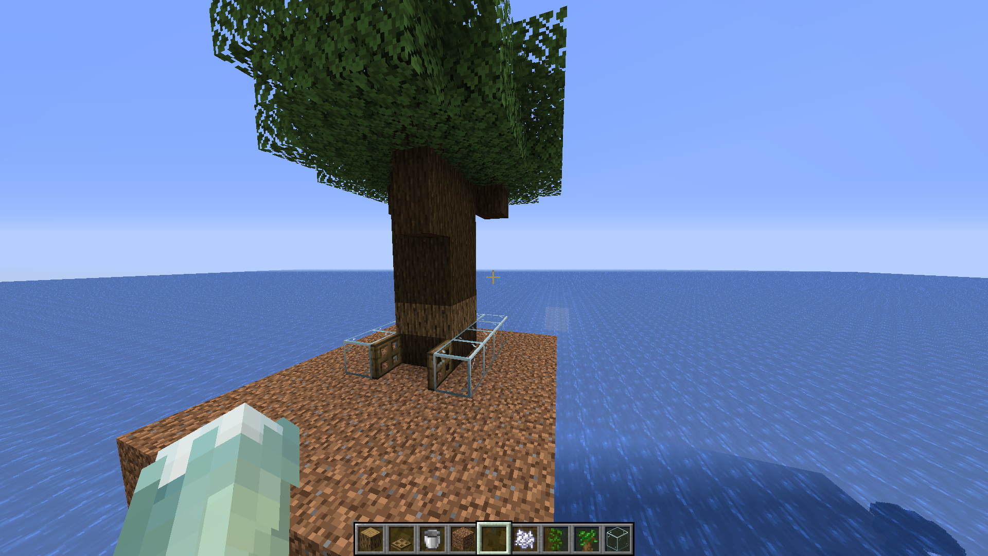 Screenshot 1 shows a bugged Dark Oak tree, as well as an Acacia tree and a giant Jungle tree that grew correctly in similar conditions. Screenshot 2 shows a non-bugged Dark Oak tree grown in an identical planter, but out of water.