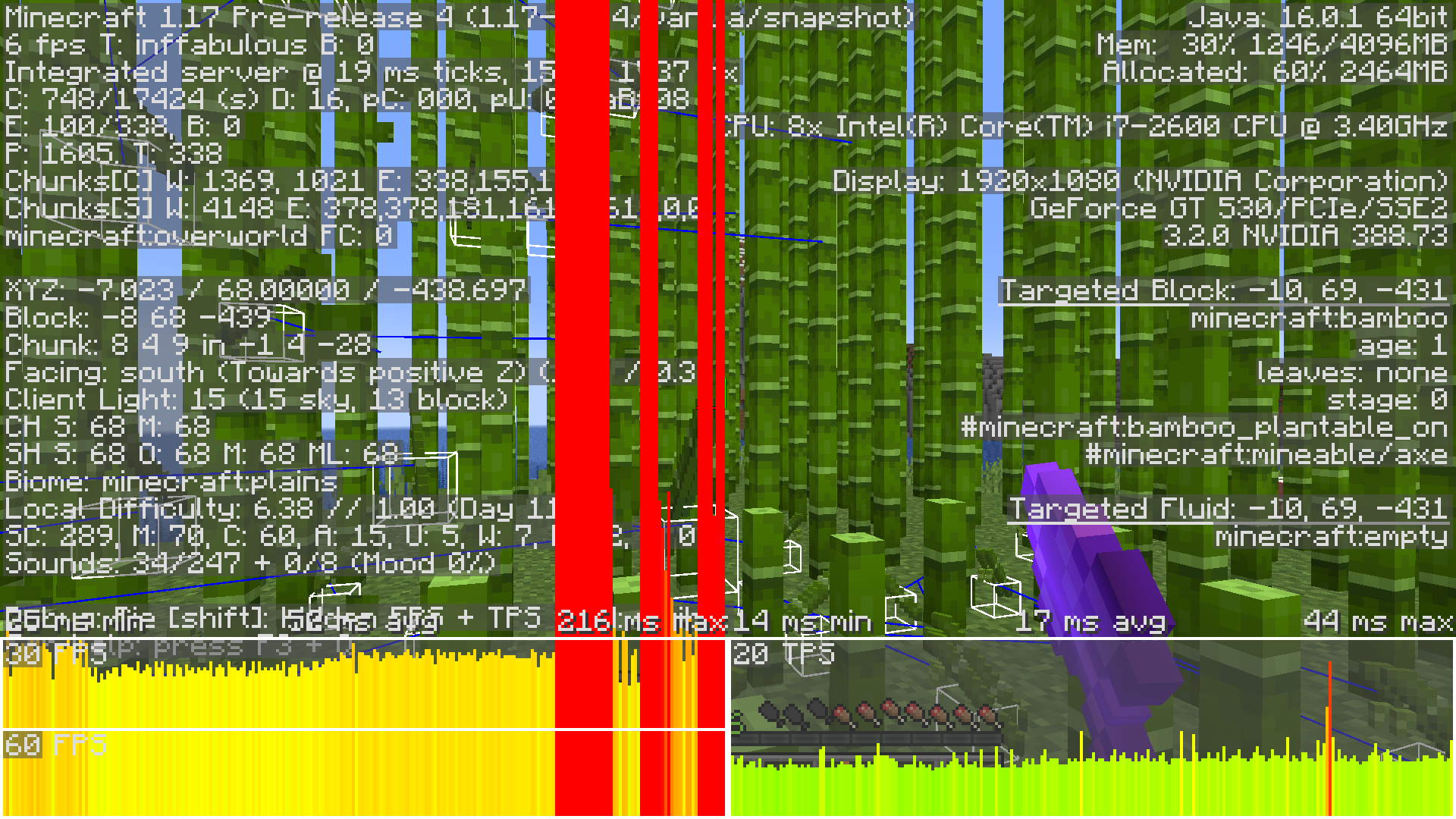 Breaking bamboo in 1.17-pre4 is incredibly laggy compared to the snapshots. Not sure what would be the cause of this.