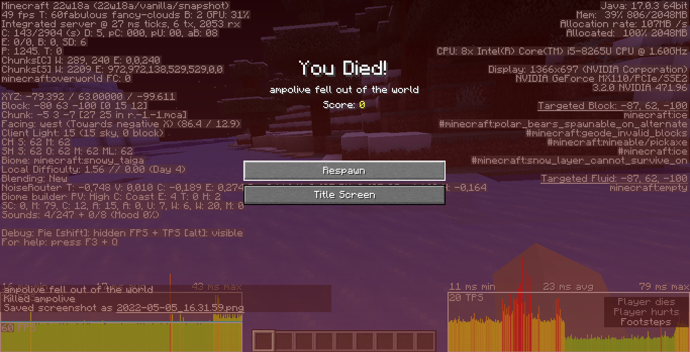 This is caused because of how LivingEntity handles death events. When an entity is killed and finishes their death animation, RemovalReason “KILLED” is called which removes said entity from chunk tracking. While this works for regular entities, players can still see the world on the death screen, and being “removed” as a player causes a ghost world state where all ticks are frozen, entities stop updating, and block updates are ignored.