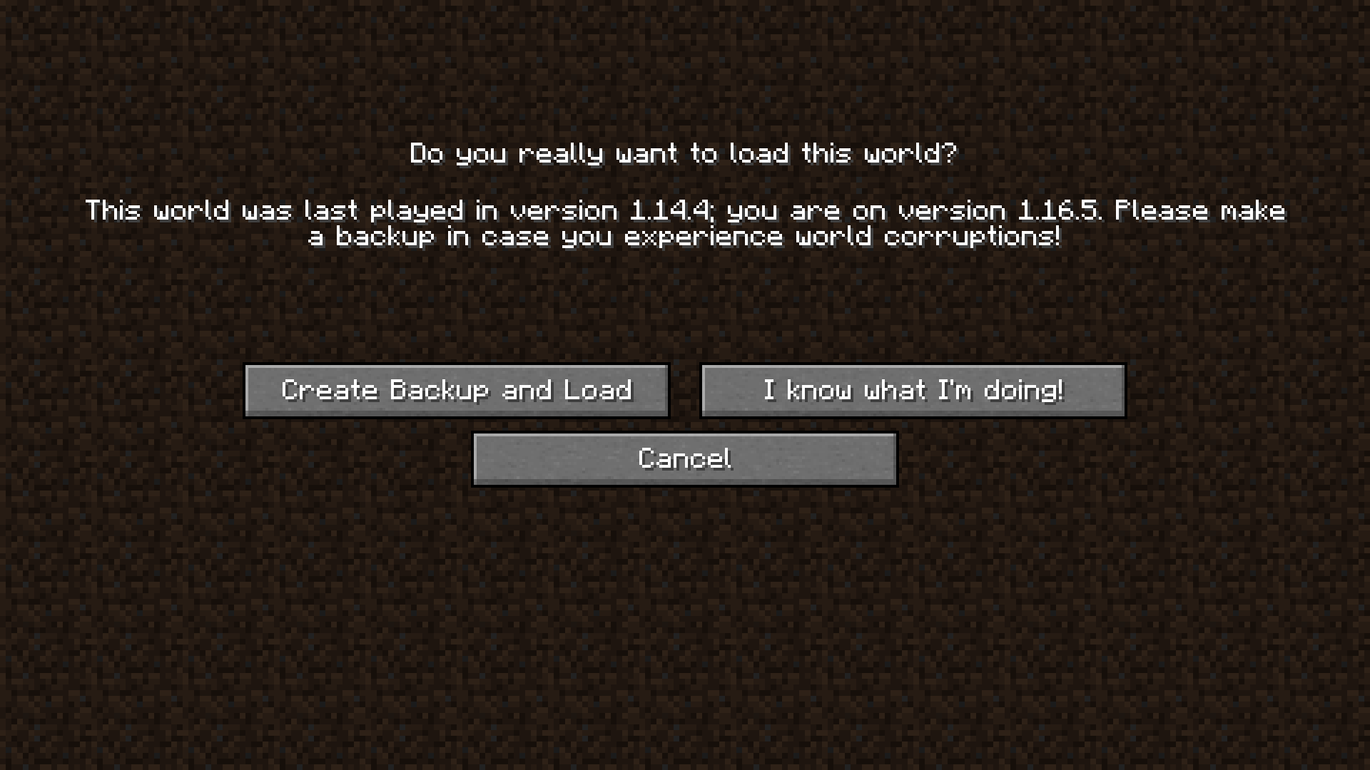 As in the title, the "create backup" message when opening old (in my case 1.16.5.) world in the newest version is gone, world just loads. That backup prompt existed in in stable versions before, added screenshot from version 1.16.5. as a proof.