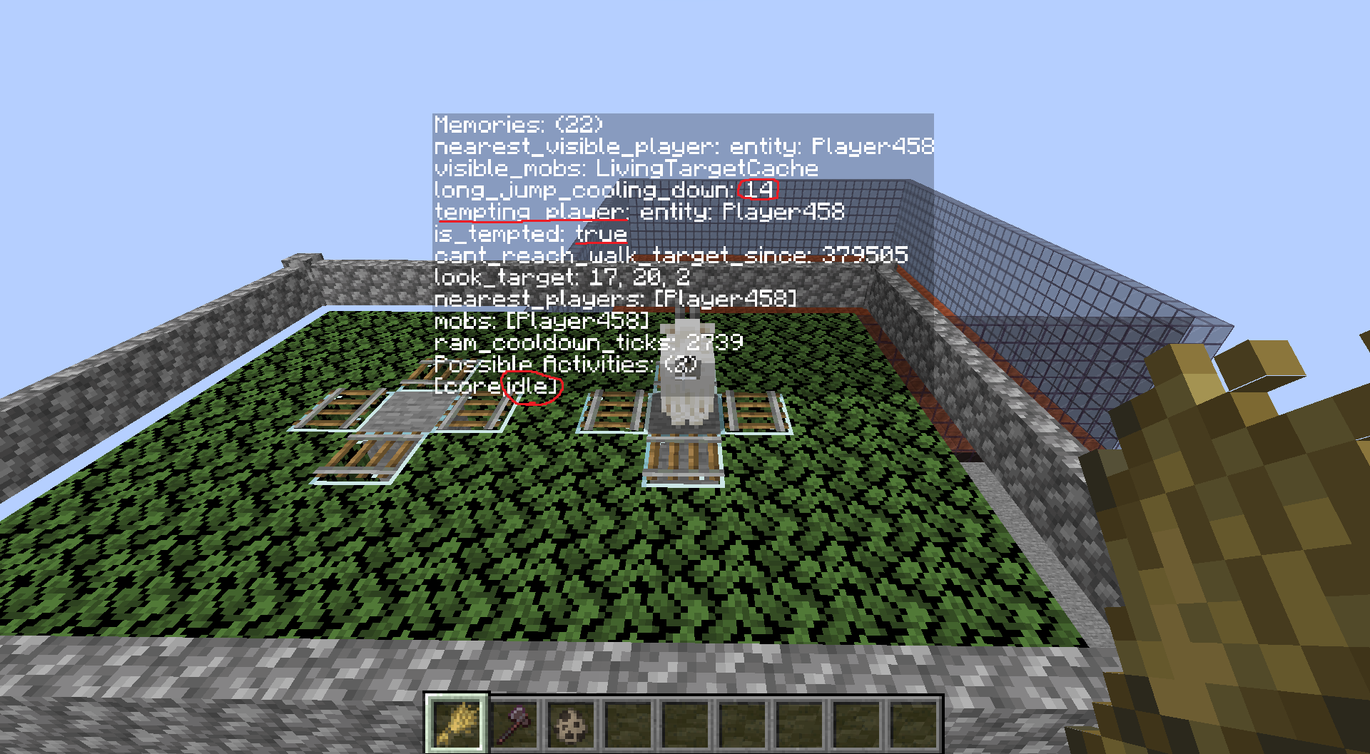 minecraft:long_jump_cooling_downis no longer existent in the goat's memory:/data get entity @e[type=goat,limit=1,sort=nearest] Brain.memoriesSwitch your selected item to something other than wheat, then switch back to the wheat after a second
