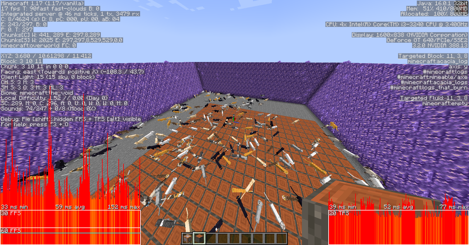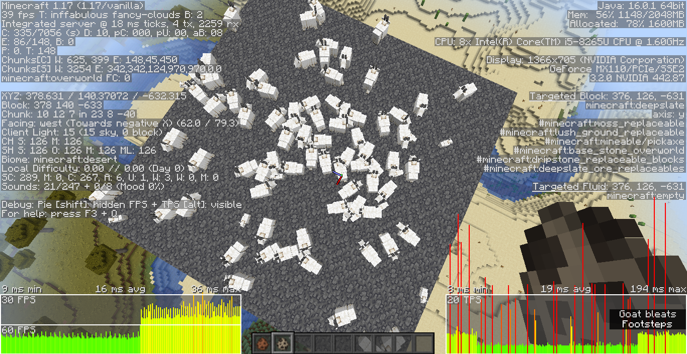 Goats are even laggier than axolotls. Just about 80 goats is enough to drop 80 fps to 30 fps and bring the server to about 22 MSPT average. This is more or less the same impact that 300 axolotls have on my computer.
