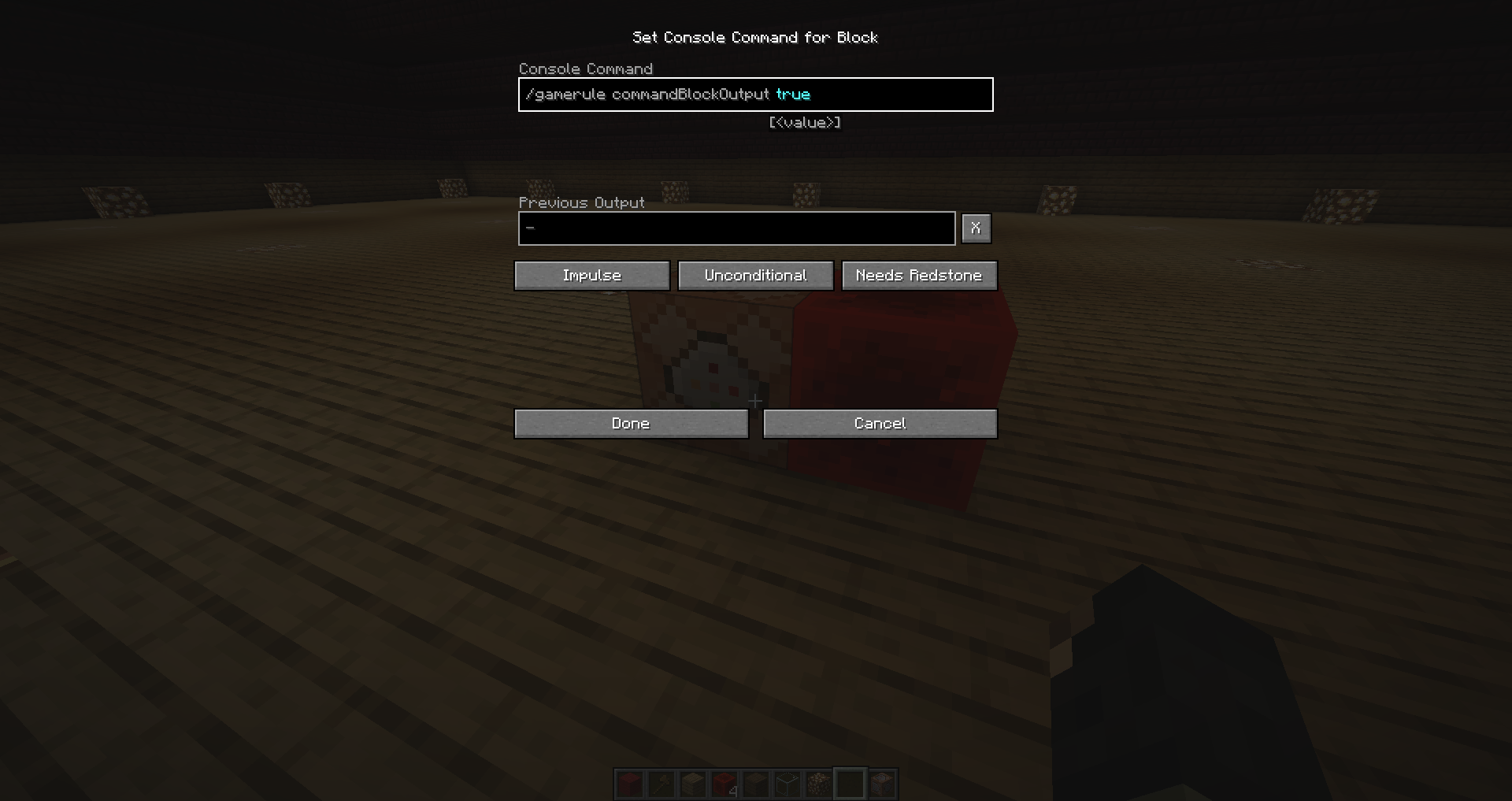 Also notice that the gamerule DocommandBlockOutput is for the output in the chat only, and not for the output in the command block itself. The window of the output in the command block is only empty because the command block didn't execute its command yet.